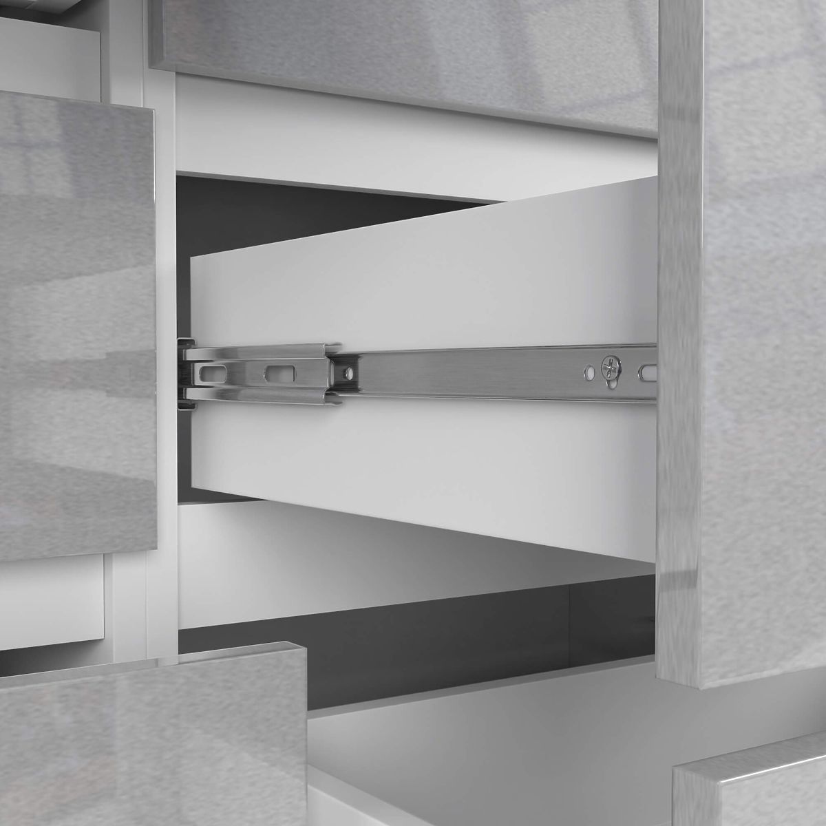 - Zásuvky se pohybují na kovových kuličkových pojezdech