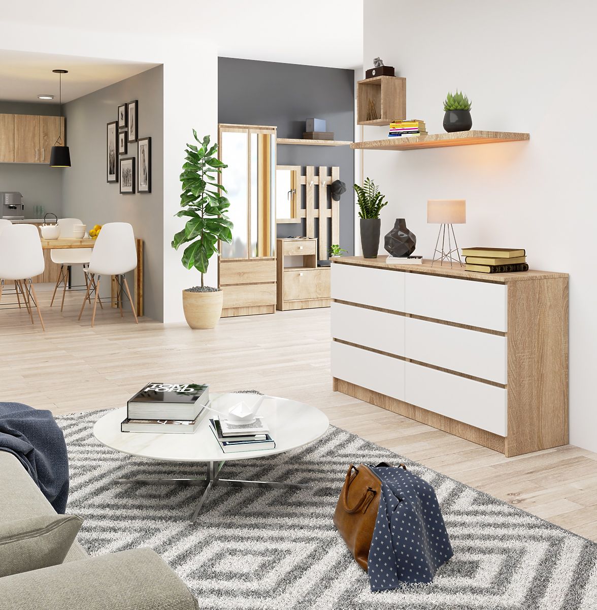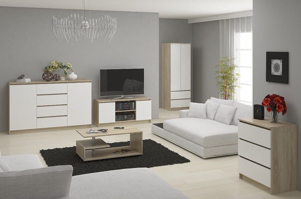 Velká komoda vybavená šesti zásuvkami je zajímavou nabídkou vytvořenou na základě potřeb a očekávání zákazníků sledujících nejnovější trendy v aranžmá, kteří preferují světlý, snadno udržovatelný a především funkční nábytek. Komoda K140 je kombinací dvou velmi módních barev - bílé a dubu sonoma. Nábytek může být úspěšně použit v obývacím pokoji, stejně jako v pokoji pro mládež nebo hosty. Hodí se také do ložnice, jídelny nebo kanceláře.