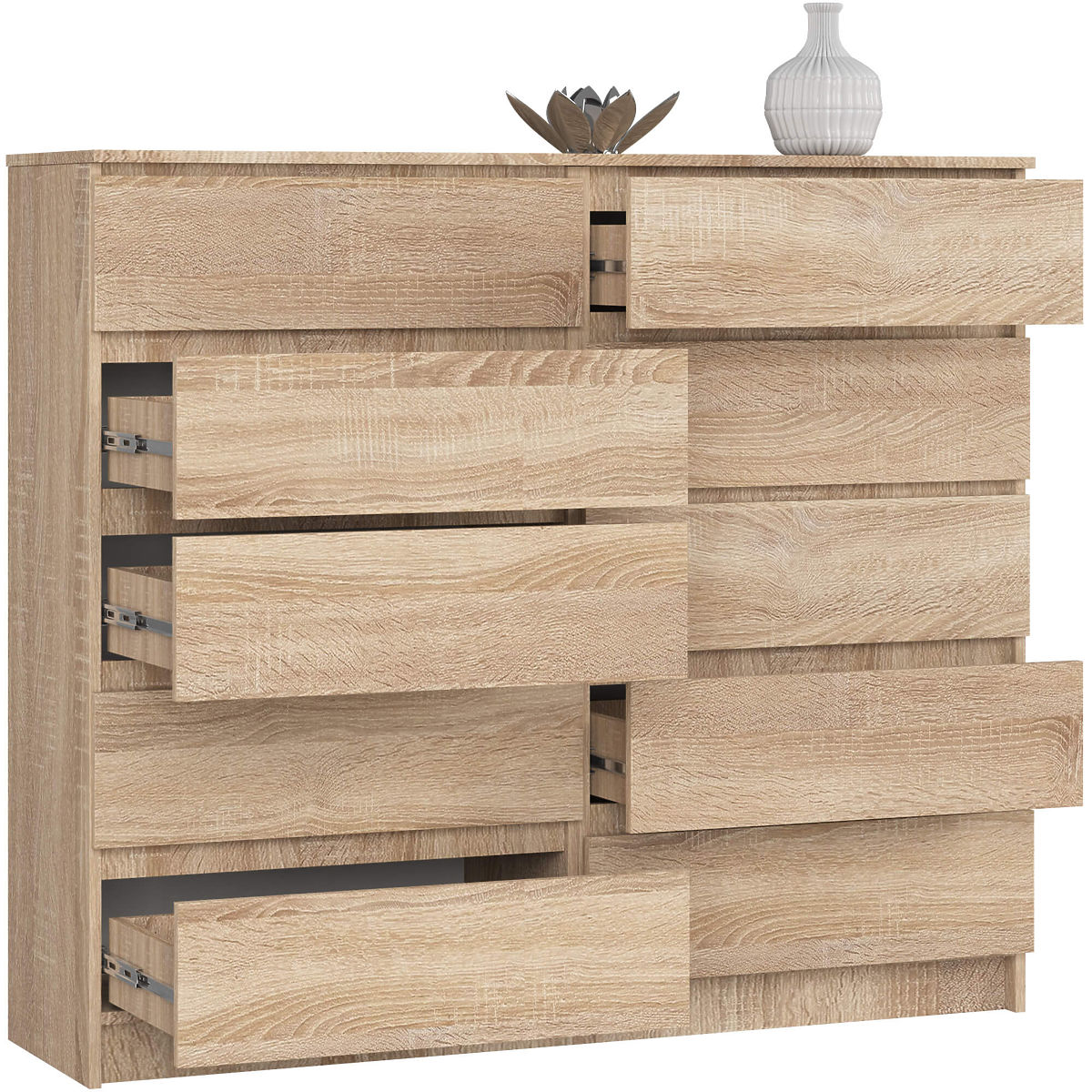 Solidní nábytek z naší nabídky je oblíbený mezi zákazníky, kteří preferují klasický minimalismus. Představovaná komoda K140 zaujme jednoduchým tvarem, univerzální barevností (dub sonoma) a praktickými řešeními. Zaměřujeme se především na kvalitu, nabízíme nábytek vyrobený z odolných a kvalitních materiálů. Náš doporučovaný model vybavený deseti zásuvkami se velmi dobře hodí do obývacího pokoje, ložnice nebo kanceláře, ale také do mnoha dalších místností, které chcete zařídit módním a funkčním způsobem. Dobrá kvalita za nízkou cenu jistě potěší příznivce moderních řešení. Doporučujeme také seznámit se s dalšími kusy nábytku z této kolekce - všechny komody se vyznačují solidním zpracováním a odolnými materiály, ze kterých jsou vyrobeny.