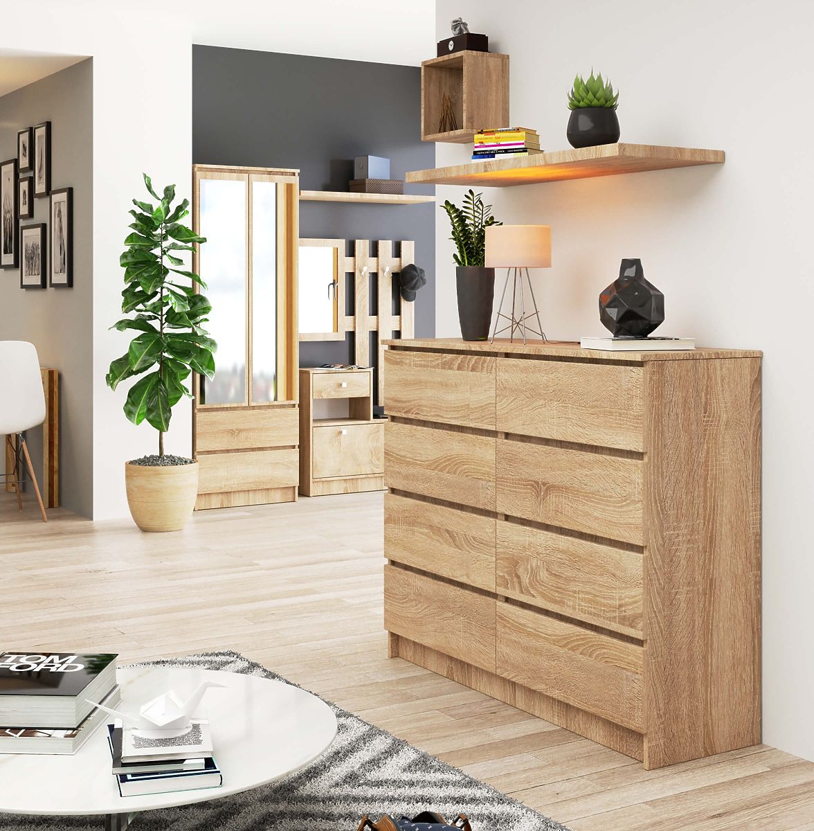 Osm zásuvek, které pojmou všechny potřebné věci v dané místnosti, a široká 120 centimetrů deska - to je komoda K120 v módní barvě dub sonoma. Vysoce kvalitní produkt se vyznačuje pevnou konstrukcí zajišťující trvanlivost výrobku a univerzálním designem. Další výhodou funkčního nábytku, který se bude skvěle vyjímat v obývacím pokoji, ložnici, jídelně nebo kanceláři, je atraktivní cena. V našem internetovém obchodě mohou zákazníci také očekávat další návrhy interiérového vybavení v barvě dub sonoma, které příjemně překvapí svou praktičností jak v kanceláři, tak doma. Doporučujeme využít naši nabídku a sestavit si sadu přizpůsobenou konkrétním potřebám.