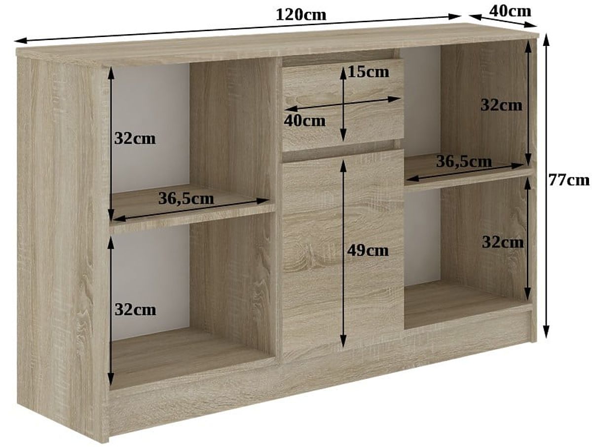 Rozměry nábytku jsou 120 cm x 77 cm x 40 cm. Všechny osoby, které hledají atraktivní, kvalitní, ale také cenově výhodnou možnost pro zařizovanou místnost, zveme k bližšímu seznámení s touto zajímavou nabídkou. Doufáme, že splní očekávání i těch nejnáročnějších osob. Komoda se skládá ze dvou otevřených polic, jedné za dvířky a jedné zásuvky. Celek se krásně prezentuje samostatně i v kombinaci s jiným nábytkem z této série. Zveme vás k nákupu.