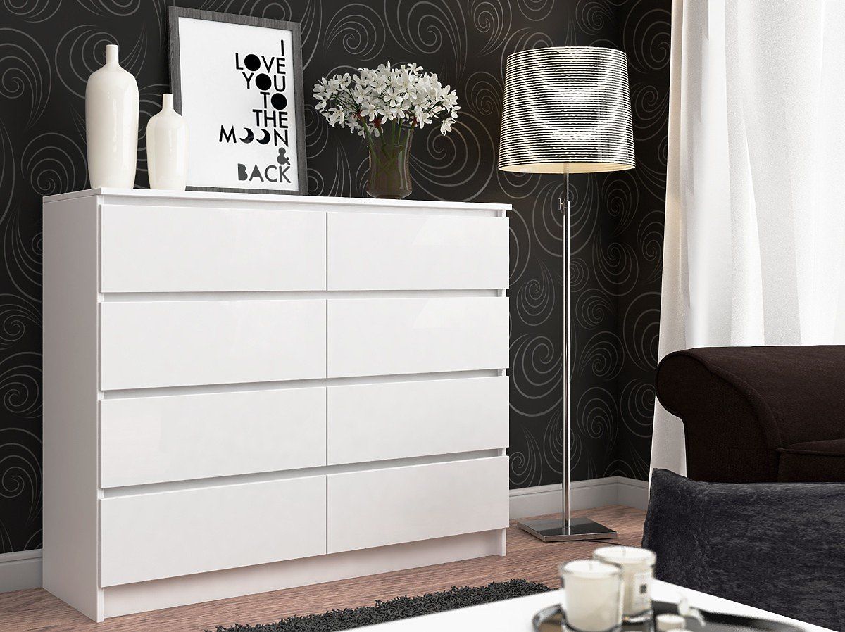 Bílá komoda s osmi zásuvkami a moderním designem. .. více