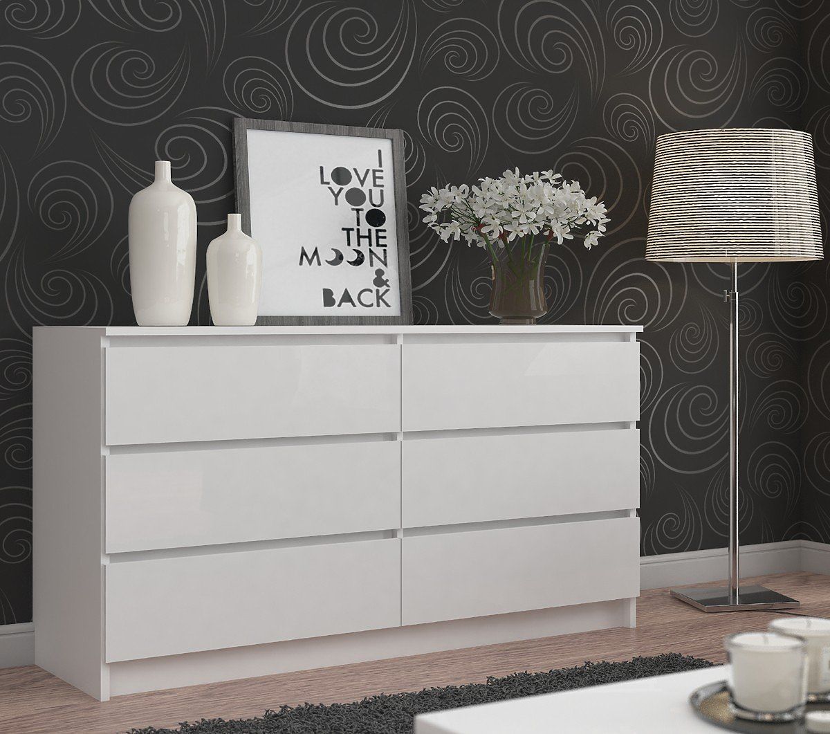 Klasicky krásná komoda v bílé barvě je jednou z mnoha zajímavých nabídek našeho internetového obchodu. Nábytek se skládá ze šesti prostorných zásuvek. Každá z nich bez problémů pojme všechny potřebné předměty v dané místnosti. Komoda se velmi dobře bude vyjímat v obývacím pokoji, ale také v dětském nebo mládežnickém pokoji. Dále může být použita v ložnici, hostinském pokoji, jídelně, předsíni, a také v místnostech s nebytovým charakterem - například v hotelech či kancelářích.