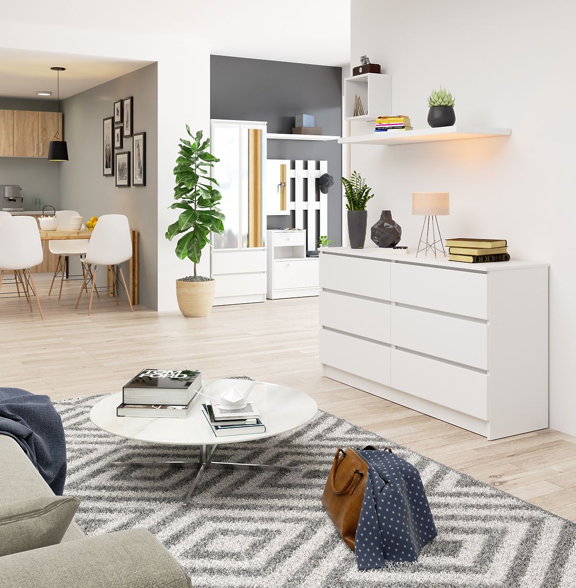 KOMODA K140 6 ZÁSUVKY je nábytek jednoduchý a minimalistický ve formě. Skvěle se hodí do místností s moderním a skandinávským designem, kde dominují světlé barvy. Tento bílý nábytek je ideální do obývacího pokoje, ložnice, předsíně, ale také do kanceláře či pracovny. Jeho výška je 77 cm, délka 140 cm a hloubka 40 cm.