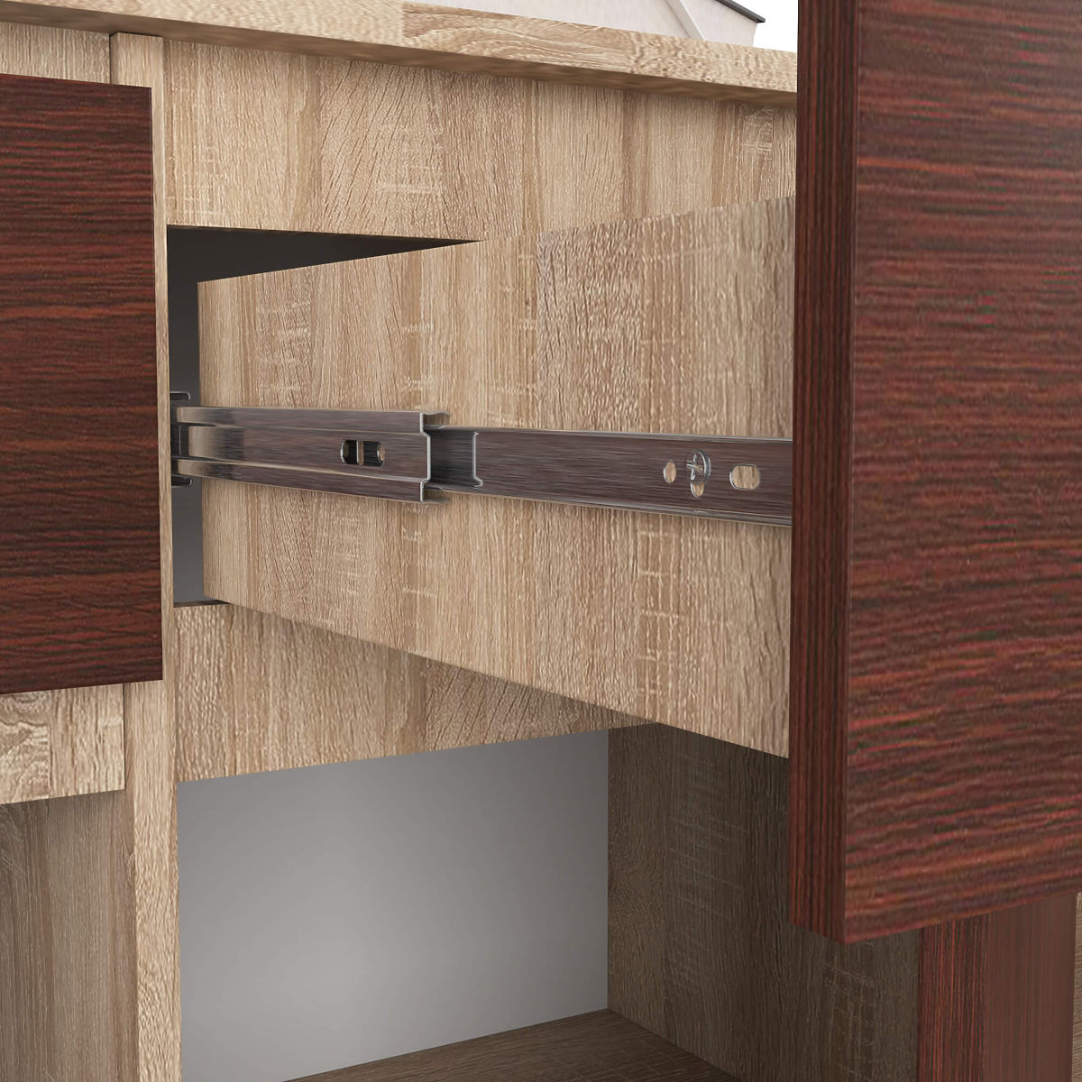 - Zásuvky se pohybují na kovových kuličkových kolejnicích