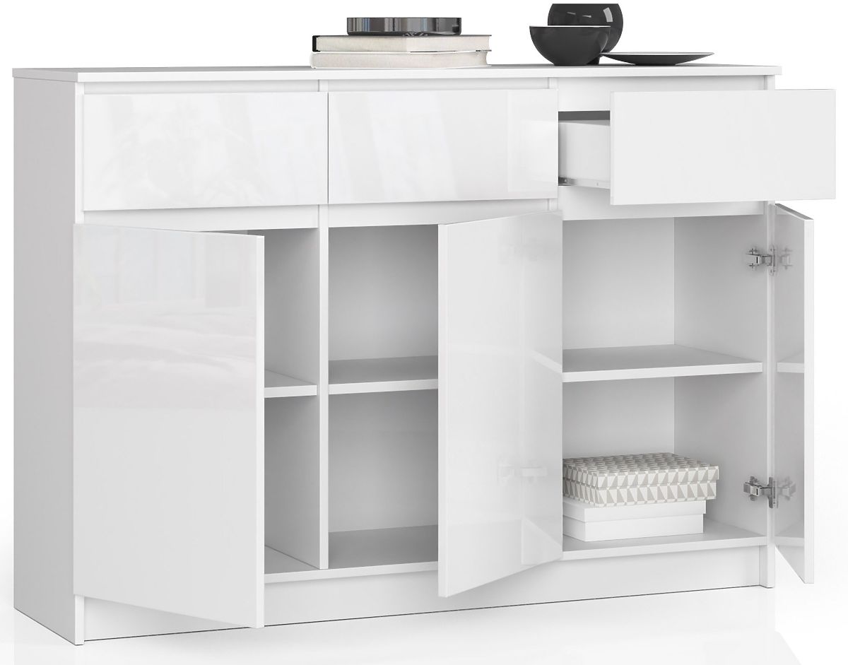 Bílá komoda s vysokým leskem a třemi zásuvkami. .. více