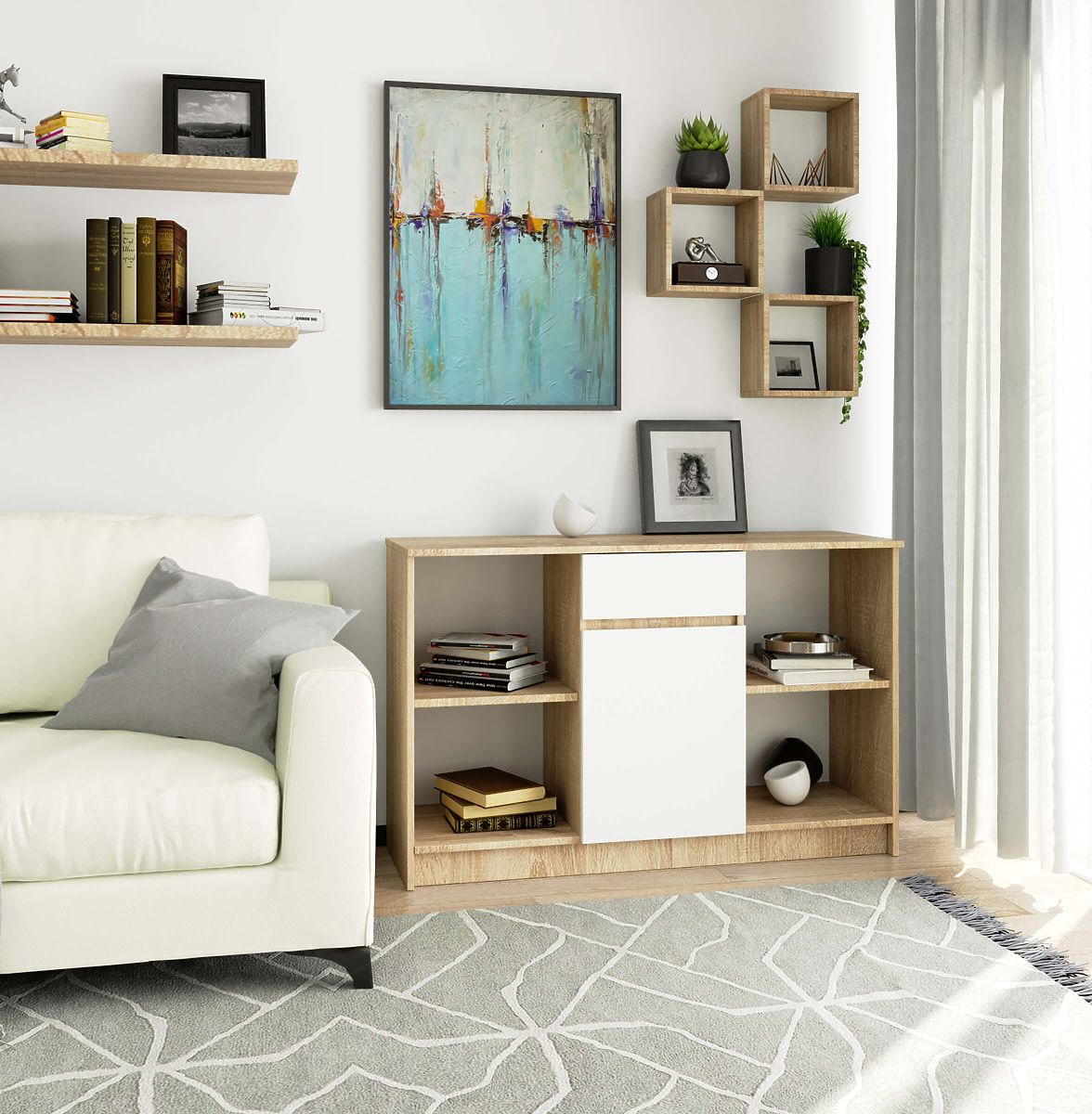Chytré provedení komody B-17 ji činí vhodnou pro místnosti jako obývací pokoj, ložnice, předsíň nebo šatna. Spojuje otevřené police s uzavřenou skříňkou a zásuvkou. Zásuvka má možnost blokace, což umožňuje ukládání cenných věcí. Je to skvělé místo pro umístění drobností, suvenýrů a různých dekorací. Kombinace bílé a světlého dřeva ji činí vhodnou pro moderní aranžmá.