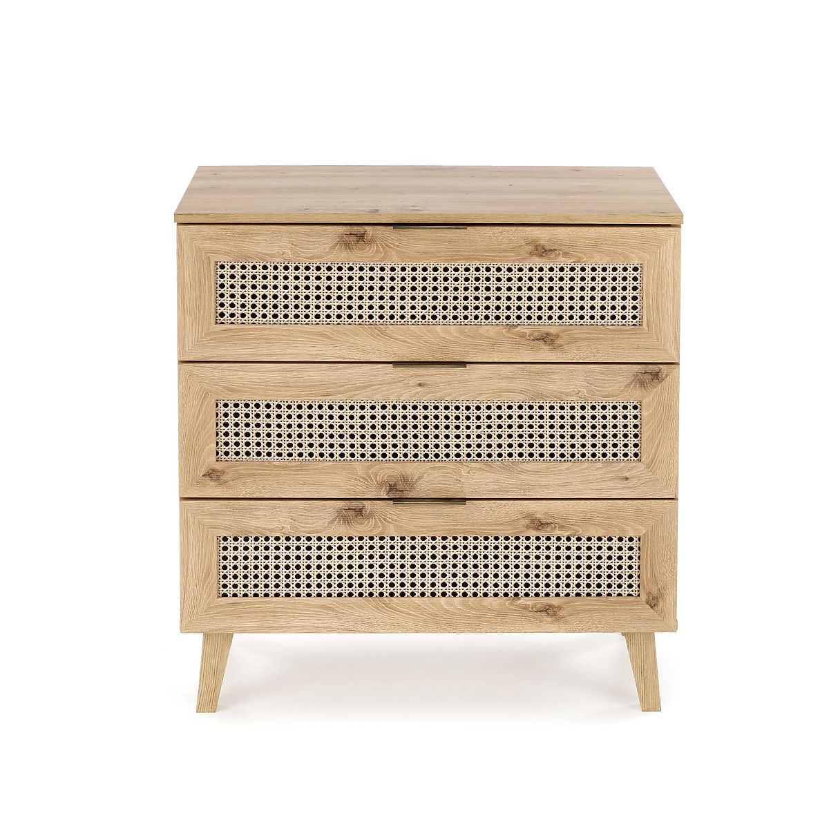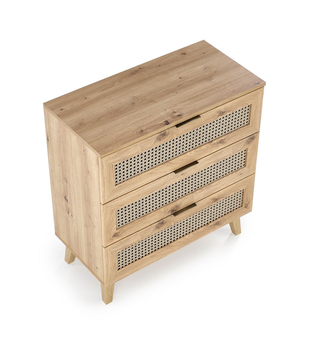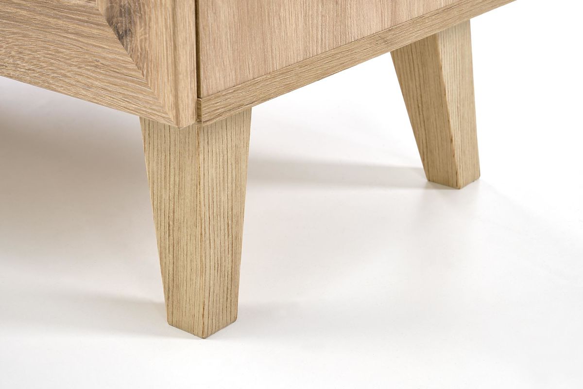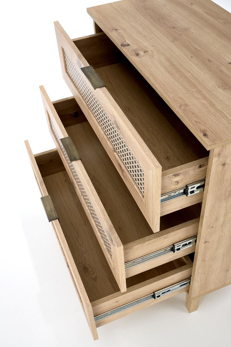 Dekor dub artisan společně s módními vložkami ve vzoru vídeňského copu dodává komodě jedinečný boho nádech, který okamžitě upoutá pozornost.
