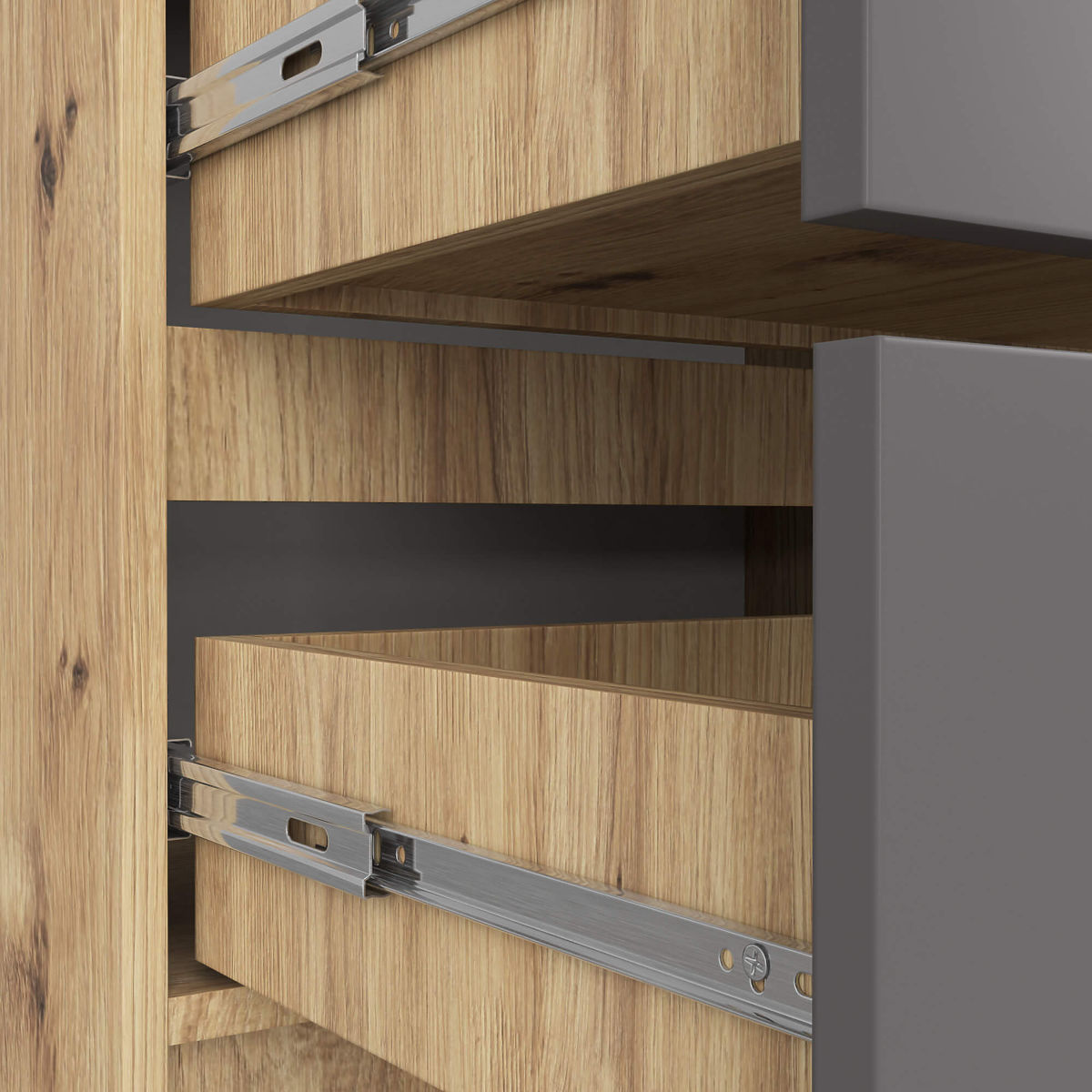 - Zásuvky se pohybují na kovových kuličkových pojezdech - Hrany olepené ABS hranou zajišťující vysokou ochranu proti poškození