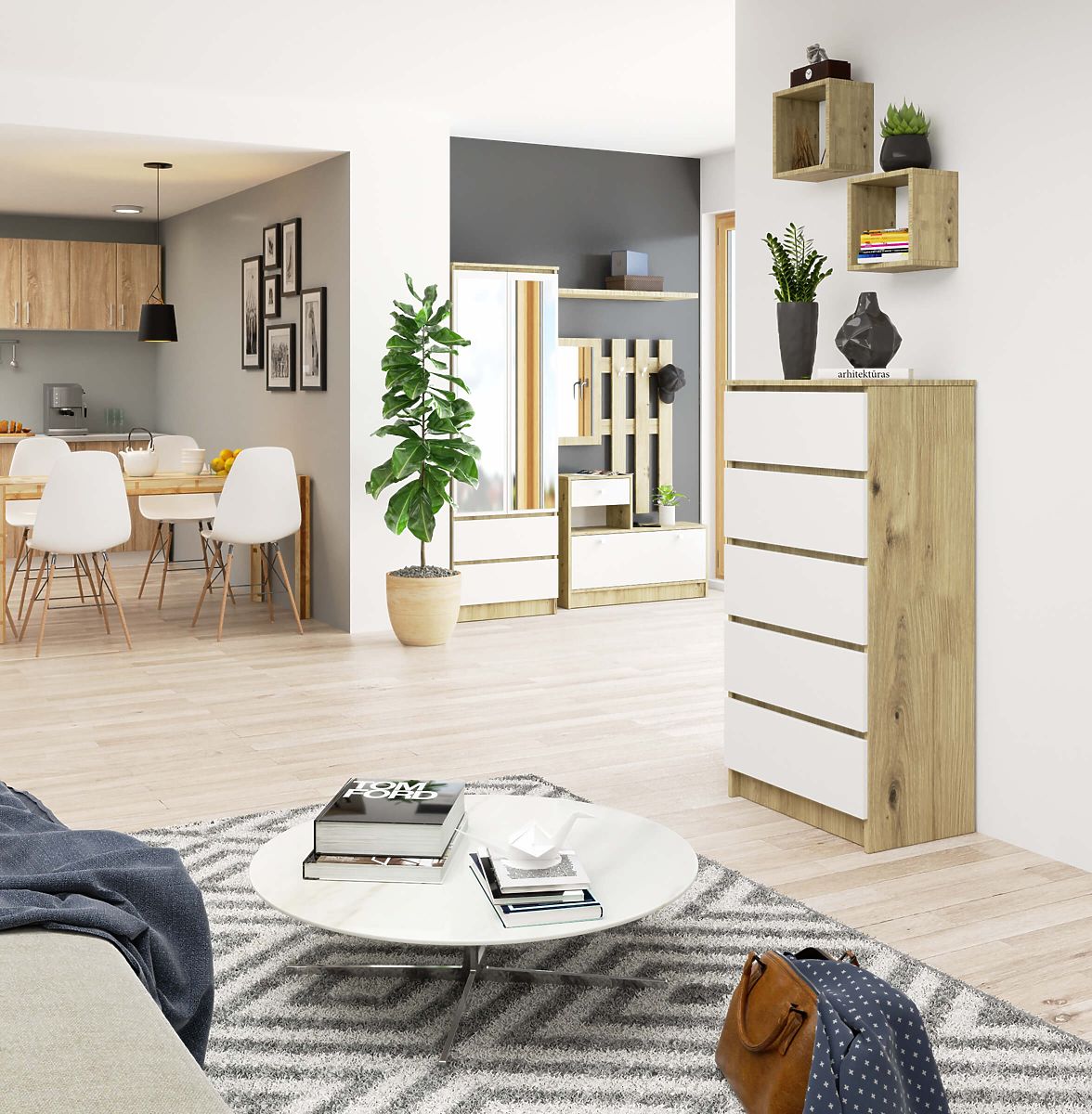 Komoda s pěti zásuvkami v kombinaci dubu a bílé. .. více