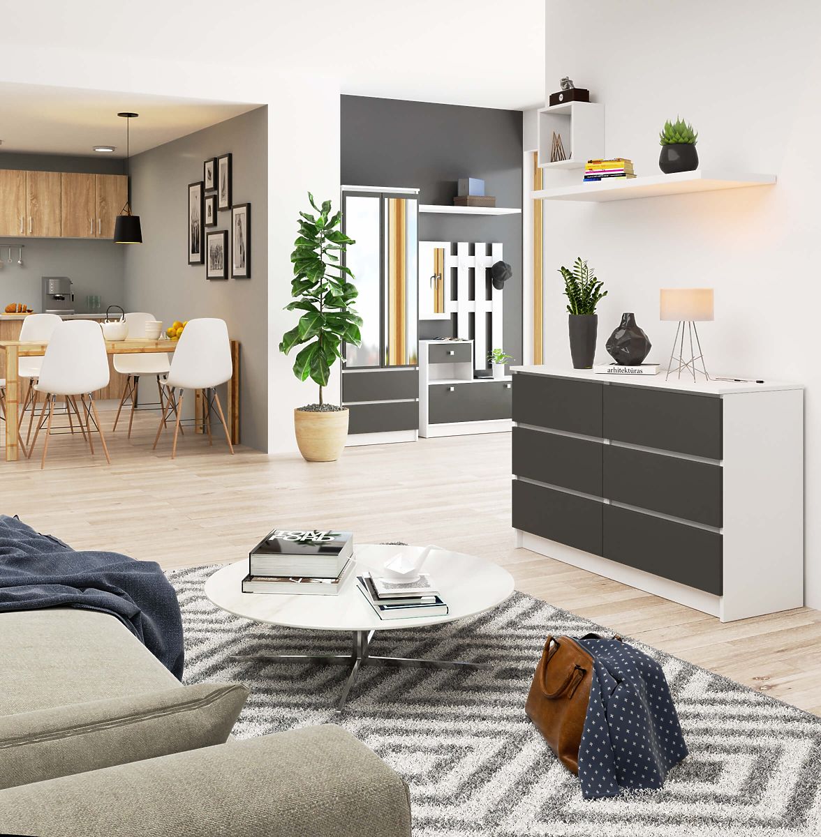 Komoda s šesti zásuvkami v bílé a šedé barvě. .. více