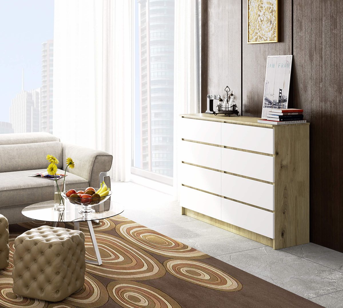 Komoda s osmi zásuvkami v kombinaci dubu Artisan a bílé. .. více