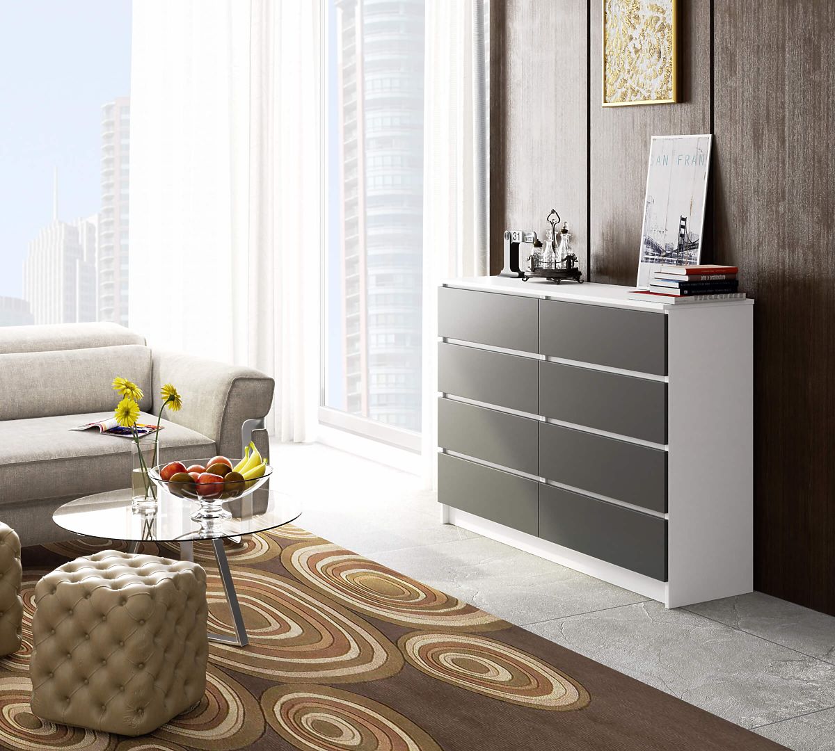 Komoda s osmi zásuvkami v bílé a šedé barvě. .. více
