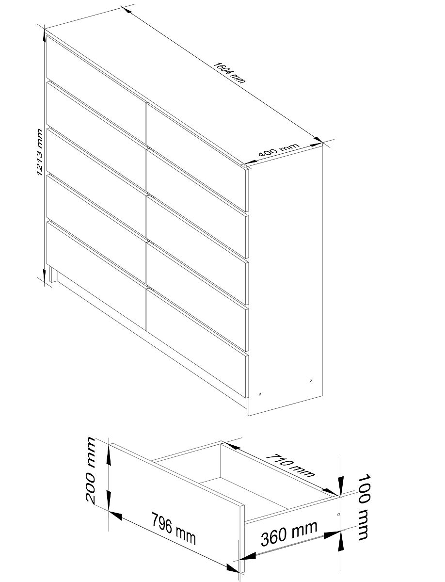 KOMODA K 160cm 10 ZÁSUVKOVÁ Vyrobena z 16mm laminované desky odolné proti oděru.