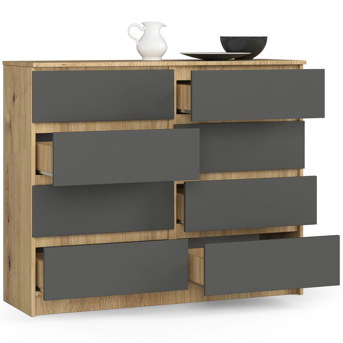 Komoda s osmi zásuvkami z laminované desky v barvě dubu Artisan a šedé. .. více