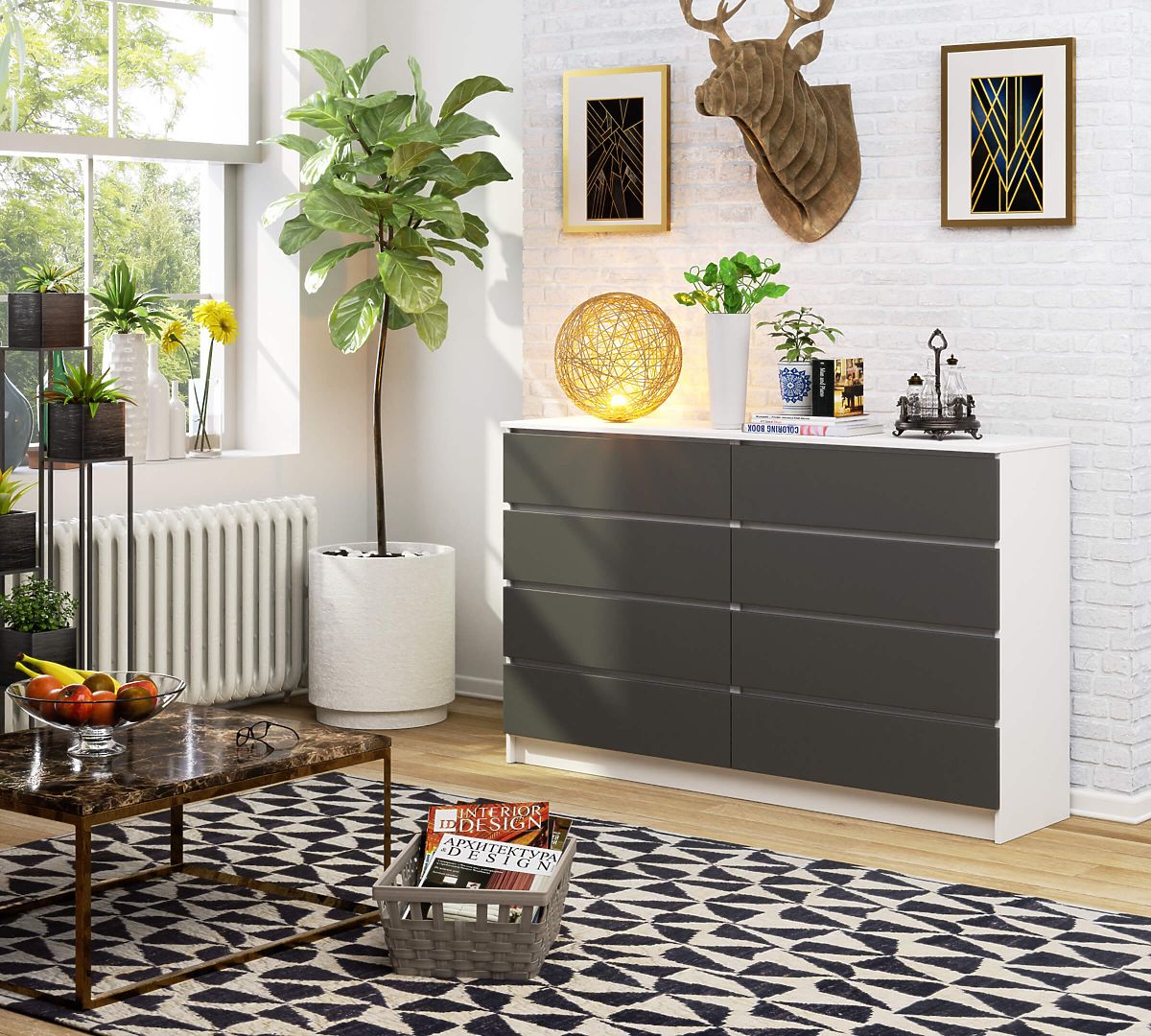 Komoda s osmi zásuvkami a matným bílým a šedým povrchem. .. více