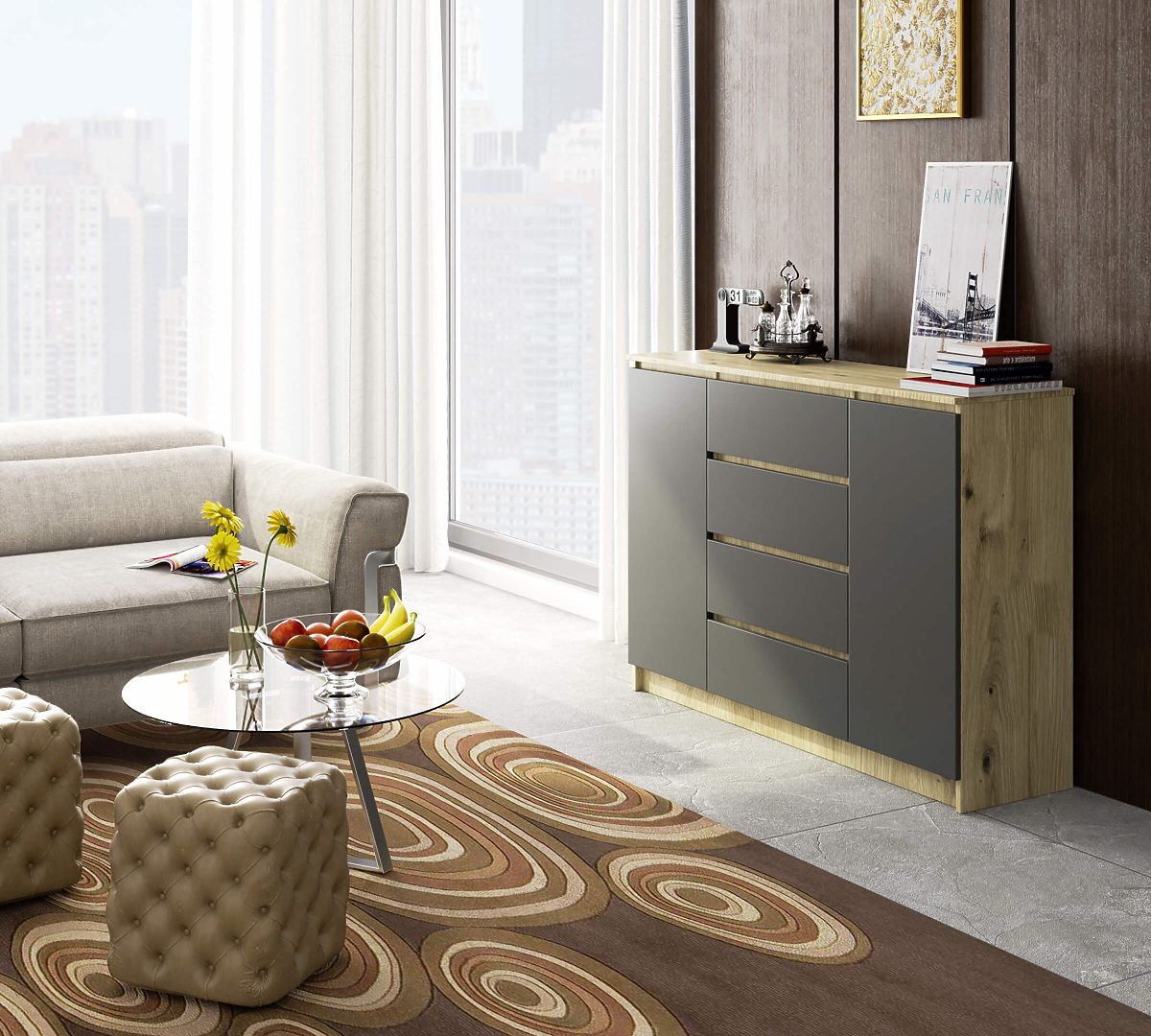 Komoda s 2 dveřmi a 4 zásuvkami v barvě dub artisan a šedá. .. více