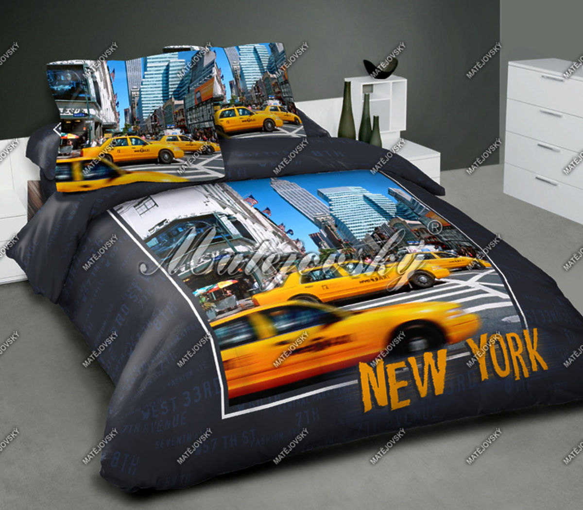 Pro všechny dobrobružné povahy, které milují cestování - oddejte se snění v ložním povlečení s designem New York City. Součástí vzoru je fotografie s typickými žlutými taxíky na pozatí mrakodrapů (přikrývka je z obou stran stejná). Polštář 70*90 je také z obou stran stejný.