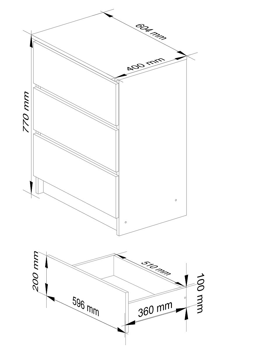 KOMODA K60 3 ZÁSUVKY Vyrobena z laminované desky 16mm odolné proti oděru.