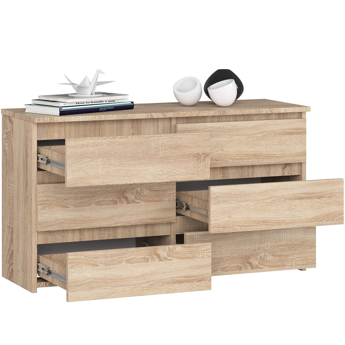 V nábytkářství se klade zvláštní důraz na funkčnost produktů a jejich vysoké estetické hodnoty. Skvělým příkladem je komoda CL 100 cm. Tento praktický kus nábytku je vyroben z laminované desky odolné proti oděru, což zaručuje jeho trvanlivost a odolnost. V šesti prostorných zásuvkách se vejdou různé knihy, dokumenty nebo drobnosti. Někteří z našich zákazníků se rozhodují pro ukládání oblečení nebo spodního prádla. Komoda dub sonoma má elegantní design. Jednoduchá forma a elegantní provedení se hodí jak do klasických a elegantních interiérů, tak i do romantických. Tento výjimečný kus nábytku se perfektně hodí do stylového obývacího pokoje i útulné ložnice. Bývá také využíván jako součást šatníku nebo předsíně. Komoda se 6 zásuvkami je oceňována jak jednotlivci, tak podnikateli. Díky bezchybnému vzhledu a neobyčejné kapacitě se skvěle hodí jako součást vybavení kanceláří.