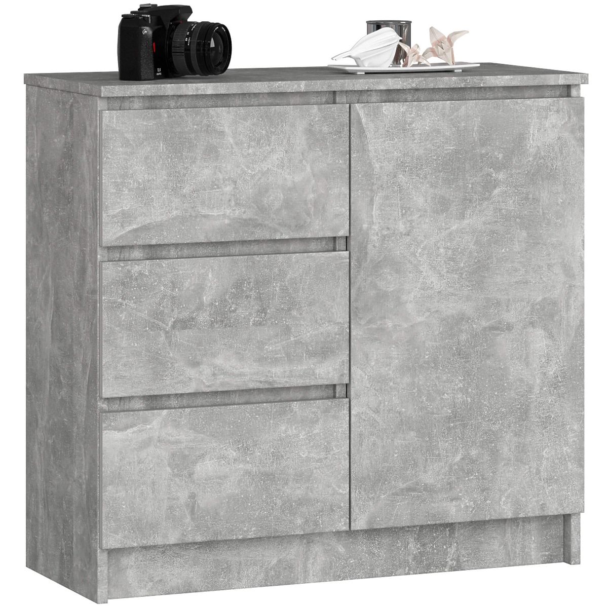 Malá komoda je prvek vybavení, který najde uplatnění v každé místnosti. Moderní barvy, pevná konstrukce a pečlivé zpracování vedly ke vzniku skříňky, která se osvědčí například v předsíni, obývacím pokoji nebo studentském pokoji, ale také v ložnici. Může být využita také v kancelářských prostorách, kde umožní ukládání mnoha dokumentů a dalších kancelářských potřeb. Komoda se skládá z jedněch dveří (uvnitř jsou dvě police) a 3 zásuvek. Nábytek kombinuje betonovou barevnost.