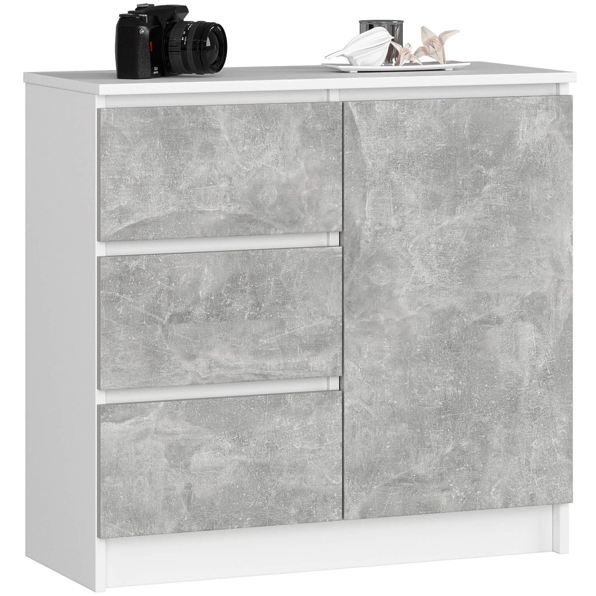 Malá komoda je prvek vybavení, který najde uplatnění v každé místnosti. Moderní barvy, pevná konstrukce a pečlivé zpracování vedly k vytvoření skříňky, která se osvědčí například v předsíni, obývacím pokoji nebo pokoji pro mládež, stejně jako v ložnici. Může být využita také v kancelářském prostoru, kde umožní ukládání mnoha dokumentů a dalších kancelářských potřeb. Komoda se skládá z jedněch dvířek (uvnitř jsou dvě police) a 3 zásuvek. Nábytek kombinuje barvy bílou a beton.