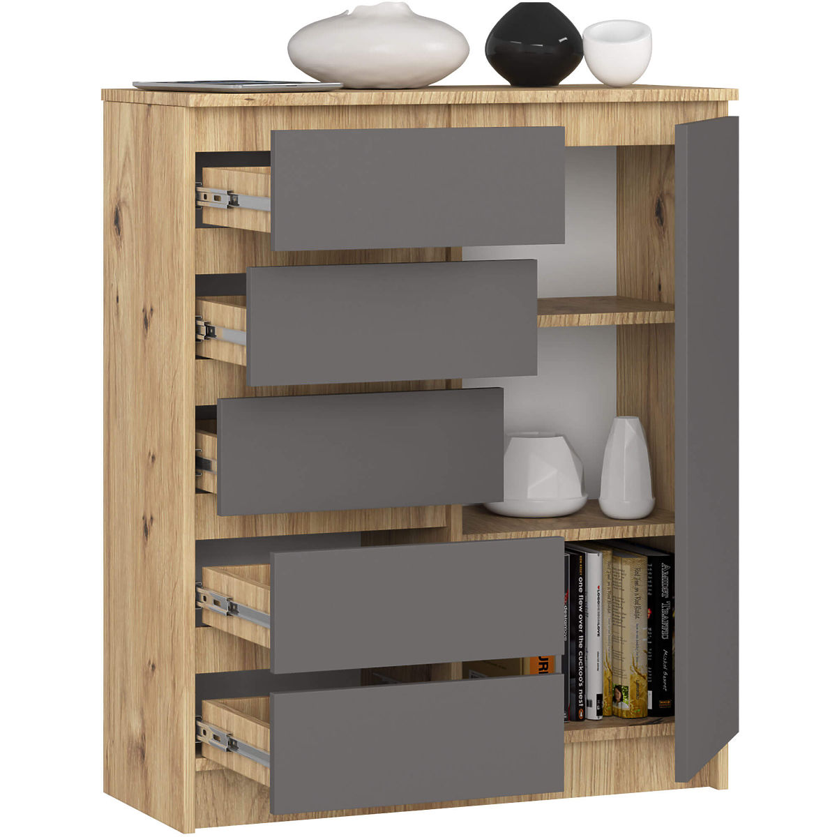 Komoda s 5 zásuvkami a 1 dveřmi v barvě dub artisan a grafit šedá. .. více
