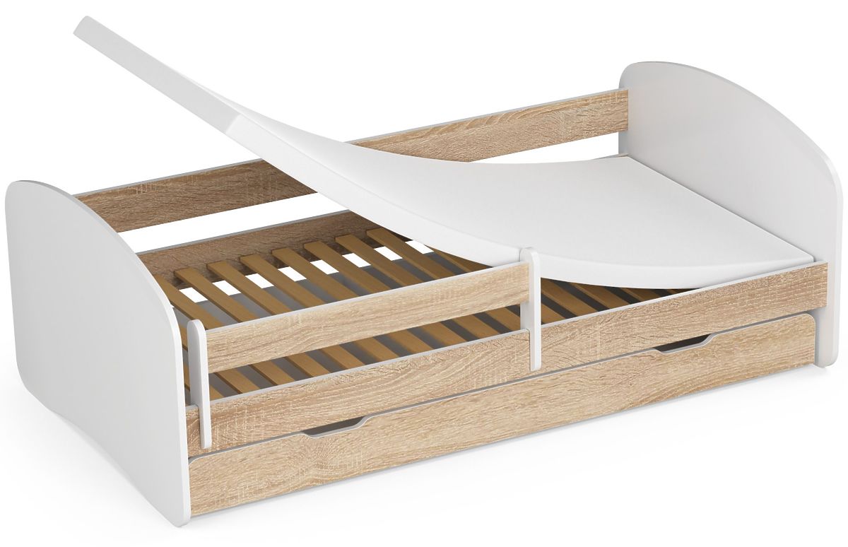 Postel SMILE o rozměrech 180x90 cm s matrací, zásuvkou a zábranou. Kompletní postel pro chlapce nebo dívku do dětského pokoje. Barva dub sonoma. Rám vydrží zatížení až 100 kg.