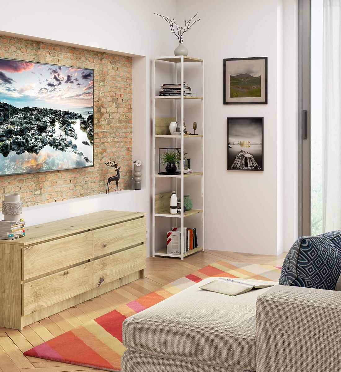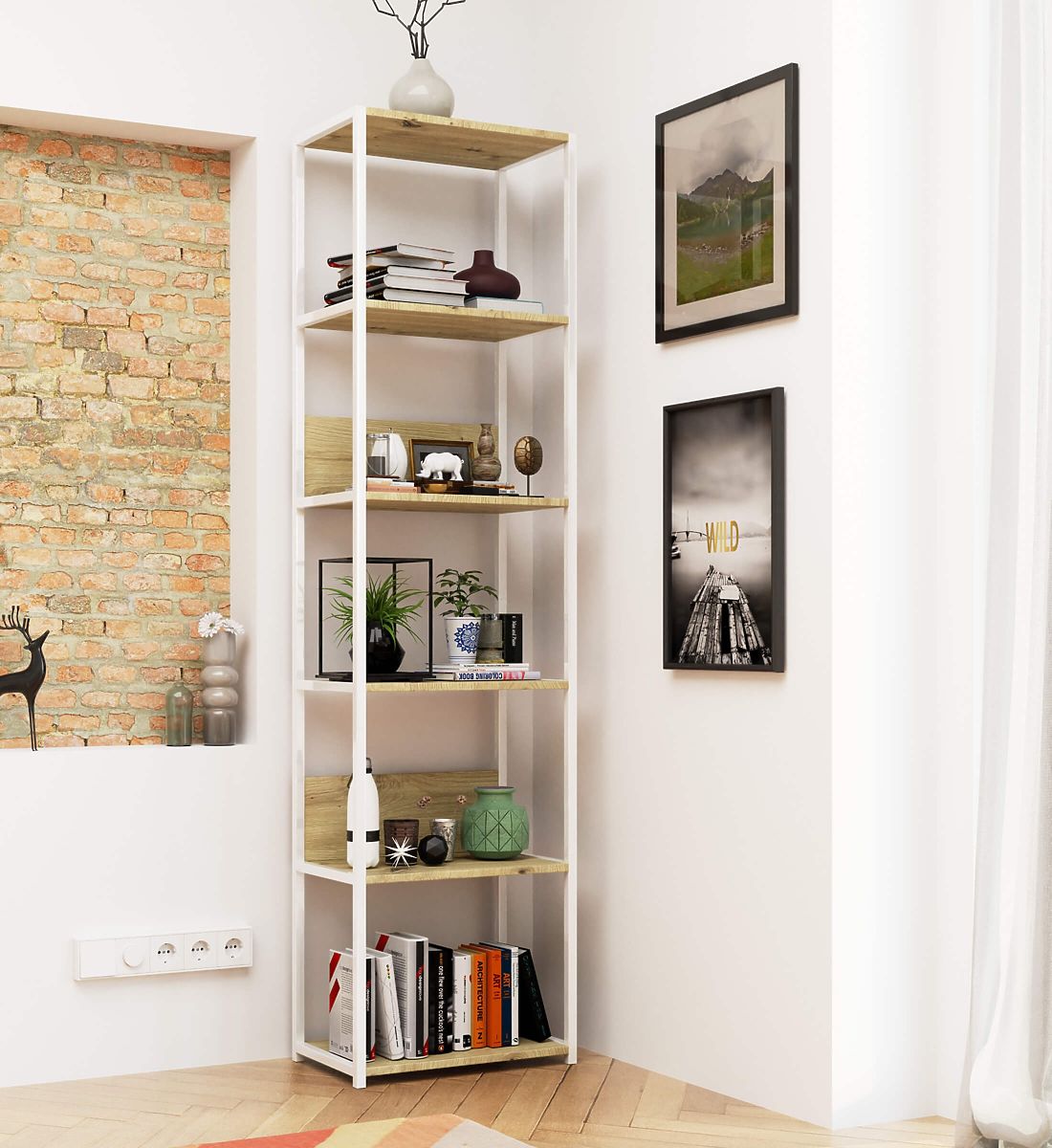 - elegantní vzhled: regál se vyznačuje jednoduchou formou, rám je v bílé barvě, zatímco deska je v barvě dub artisan,