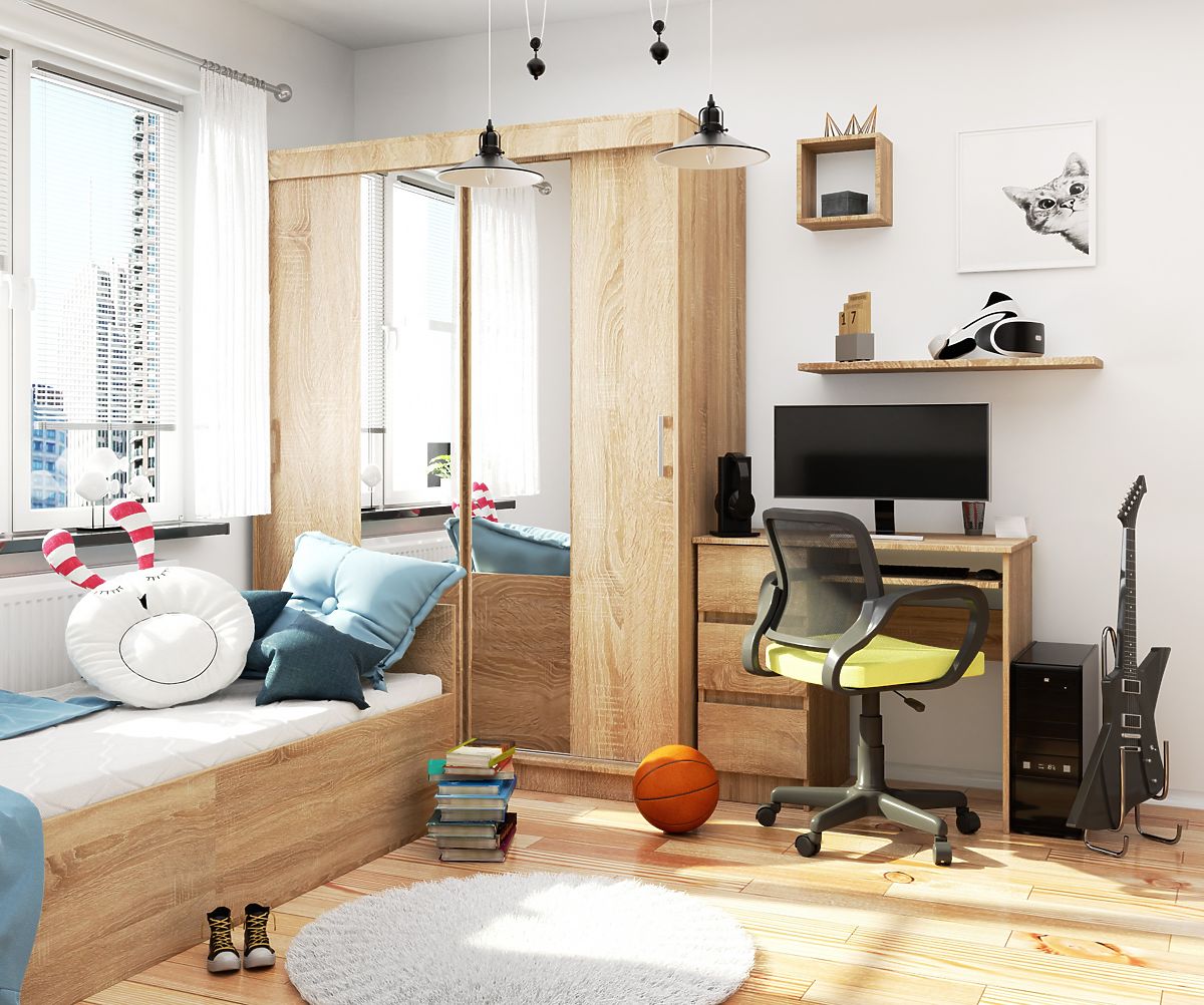 Prostorná šatní skříň v barvě dubu sonoma, s posuvnými dveřmi a zrcadlem, je univerzální a nadčasový nábytek, který splní svou funkci v téměř každé obytné místnosti. Skvěle se hodí do dětského a mládežnického pokoje, stejně jako do ložnice nebo šatny. Ve vhodně velké předsíni může sloužit jako skříň na svrchní oděvy a další potřeby nezbytné v domácnosti.