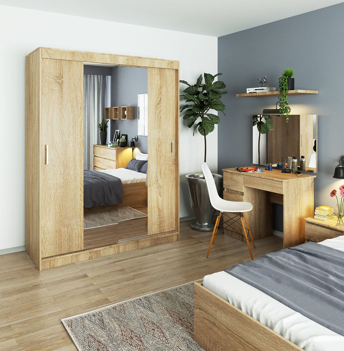 Prostorná posuvná skříň se zrcadlem v barvě dub sonoma. .. více