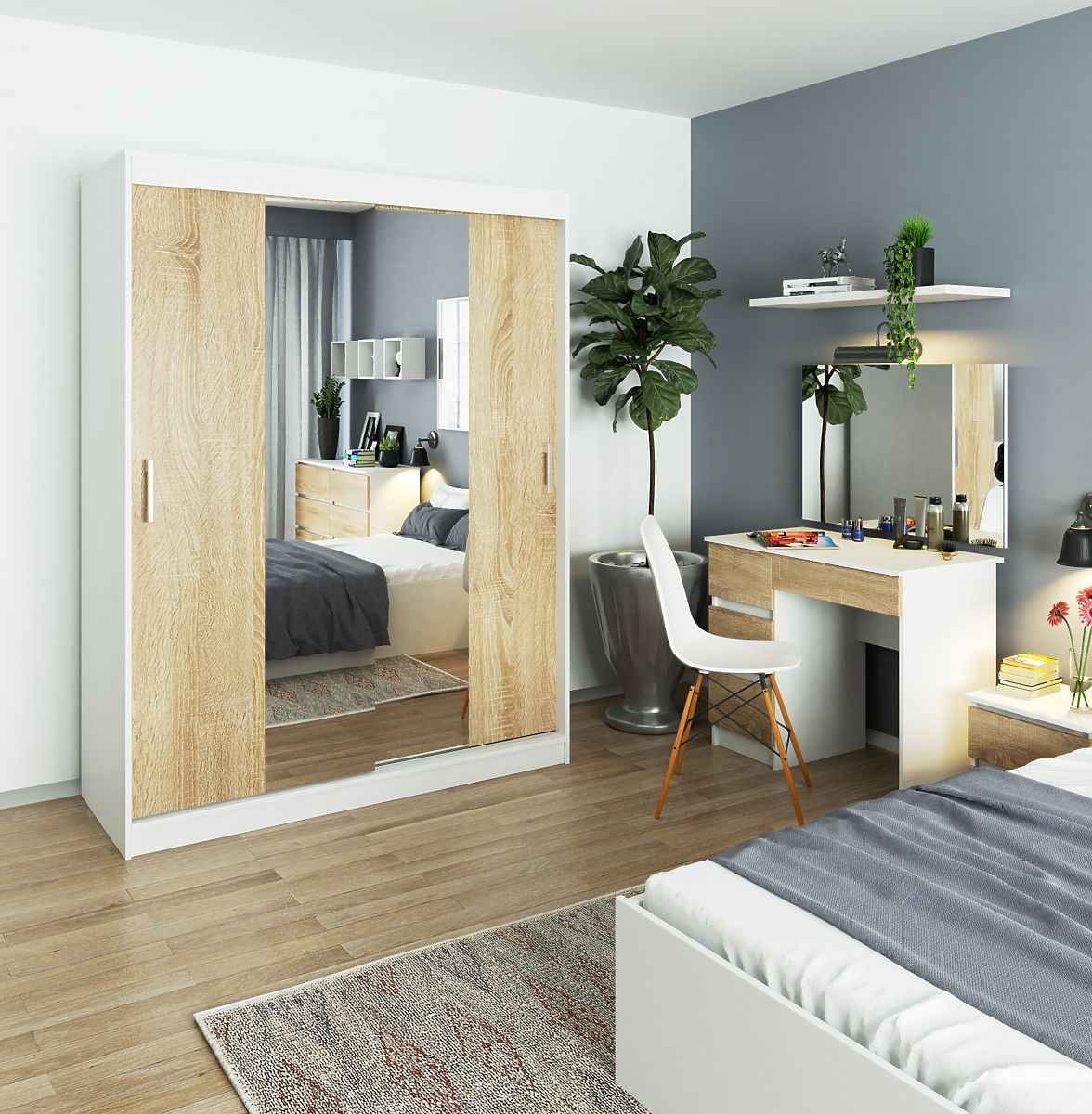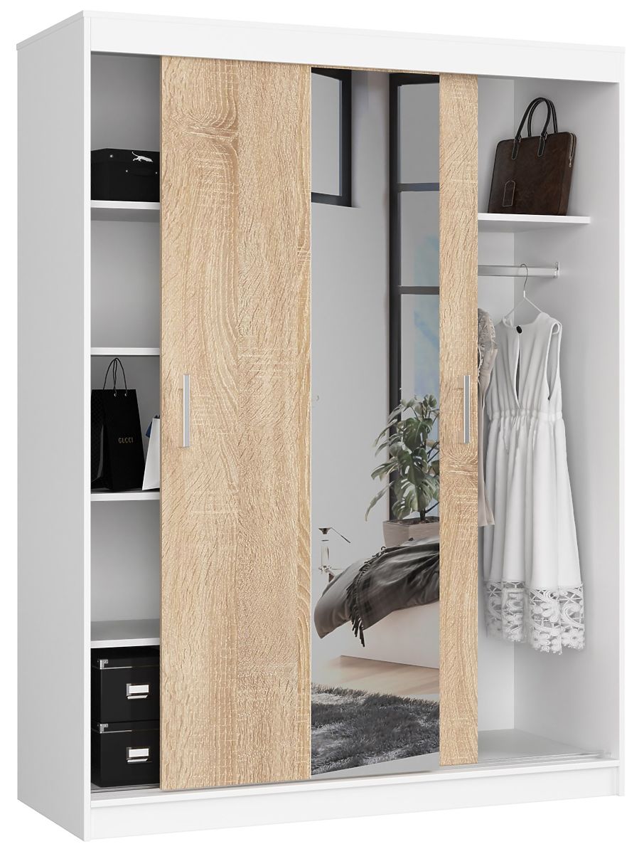 Posuvná bílá skříň s dveřmi v dekoru dub sonoma o délce 150 cm s policemi a tyčí na oblečení. Velká plocha k využití.