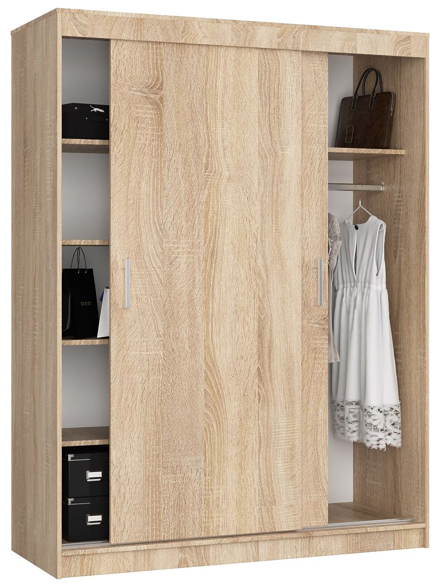 Při koupi skříně se řídíme tím, aby byla praktická a pojmula co nejvíce našeho oblečení a doplňků. Tyto podmínky rozhodně splňuje naše posuvná skříň CLP o výšce 200 cm a šířce 150 cm! Díky 6 hlubokým policím a tyči bez problémů uložíte nejen běžná trička, ale také elegantní šaty, obleky či saka. Čím se naše skříň ještě vyznačuje? Provedení v barvě dub sonoma se ideálně hodí do jednoduchých, minimalistických, skandinávských interiérů. Určitě bude také dobře ladit s bílými stěnami.