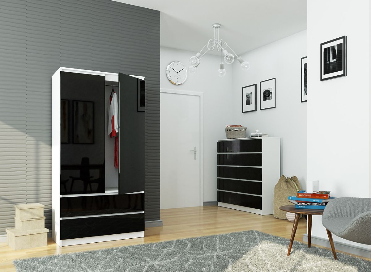 Nábytek se vyznačuje poměrně jednoduchou konstrukcí, nelze mu však upřít funkčnost. V horní části se skládá ze čtyř polic a místa na zavěšení oblečení se speciálně namontovanou tyčí, v dolní části má dvě zásuvky na kovových kuličkových pojezdech GTV. Použitá řešení způsobují, že skříň – ač působí lehce – je mimořádně prostorná. V prezentovaném modelu kombinace dvou protikladných barevných variant – hluboké černé a surové bílé – dodává celému setu eleganci a moderní vzhled, které jsou navíc zdůrazněny použitím vysoce lesklého povrchu.