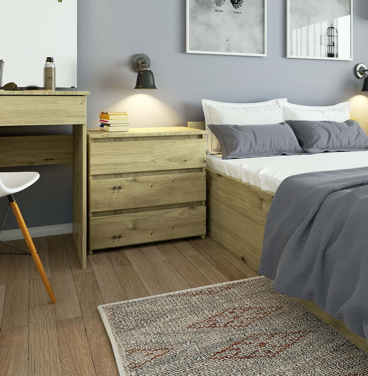 Komoda dub artisan má 3 snadno otevíratelné zásuvky. Skvěle se hodí do ložnice jako nepostradatelný prvek jejího vybavení. Do zásuvek lze uložit spodní prádlo, kosmetické doplňky nebo náhradní ložní prádlo. Deska je ideální pro umístění noční lampičky a odložení zajímavé četby. Nábytek lze umístit také do dětského pokoje a do ložnice teenagera.