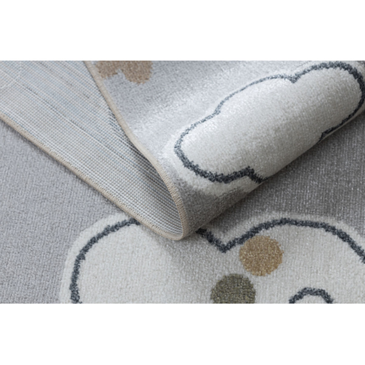 Obdélníkový koberec BONO 8437 Mraky a nebe přináší do dětského pokoje jemnost, klid a harmonii. Světle šedý podklad v kombinaci s krémovými detaily vytváří uklidňující a elegantní vzhled, který snadno zapadne do moderních i klasických interiérů.