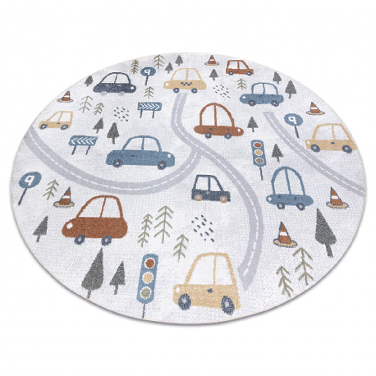 Kulatý koberec BONO 8436 Auta a ulice přináší do dětského pokoje radostnou a hravou atmosféru. Jemný krémový podklad ve spojení se světle šedými detaily vytváří moderní a příjemný vzhled, který snadno zapadne do různých stylů interiéru.