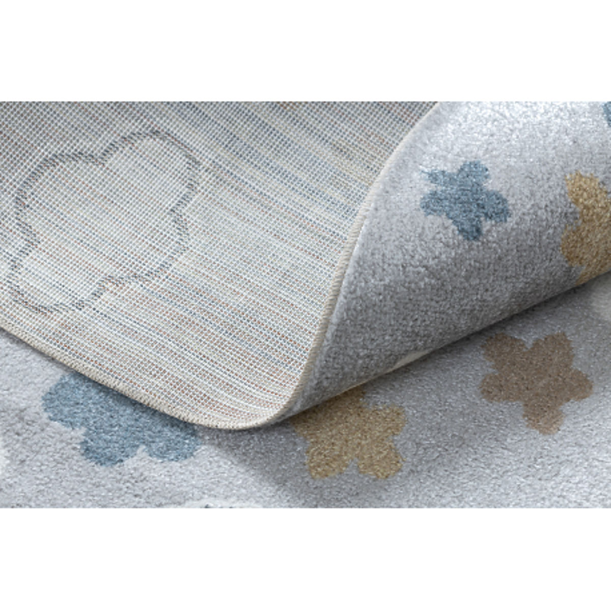 Kulatý koberec BONO 8437 Mraky a nebe přináší do interiéru jemnost, lehkost a harmonii. Světle šedá barva v kombinaci s krémovými detaily působí velmi uklidňujícím dojmem a snadno zapadne do moderních pokojů, zejména dětských nebo odpočinkových zón.