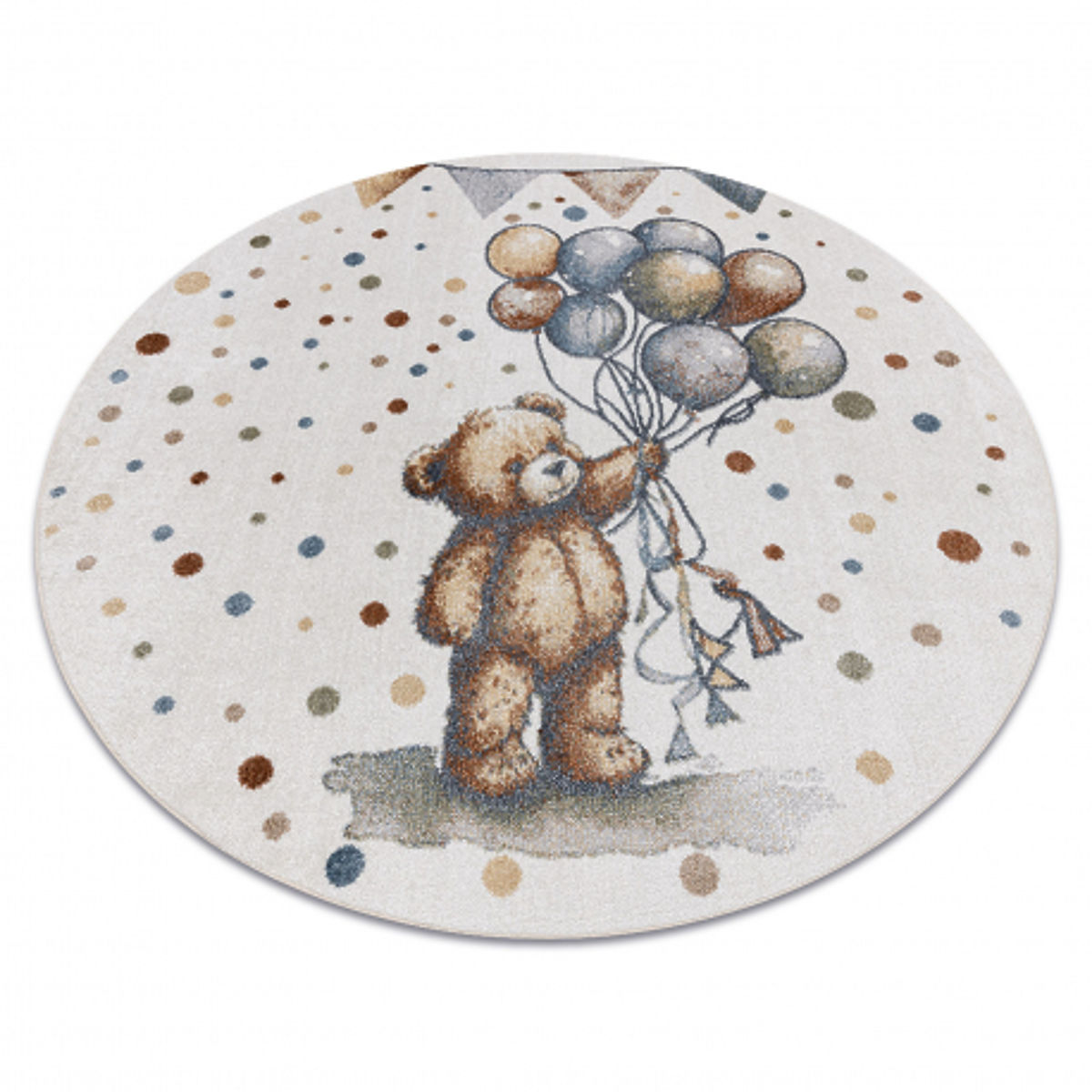 Rozkošný kulatý koberec BONO 9614 Medvěd s balónky přinese do každého dětského pokoje hravou a radostnou atmosféru. Jemná smetanová barva ve spojení se světle šedými detaily působí čistě, moderně a snadno zapadne do různých stylů interiéru.