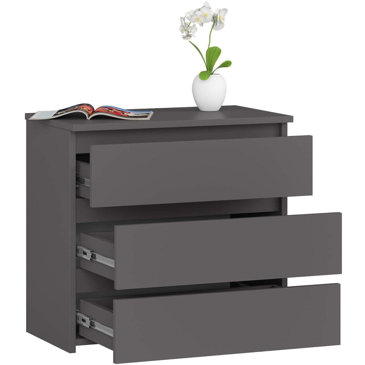 Komoda grafit šedá má 3 pohodlně otevíratelné zásuvky. Skvěle se hodí do ložnice jako nezbytný prvek jejího vybavení. V zásuvkách lze uložit prádlo, kosmetické doplňky nebo sadu ložního prádla na výměnu. Deska je ideální pro umístění noční lampičky a položení zajímavé četby. Nábytek lze umístit také do dětského pokoje a ložnice teenagera.
