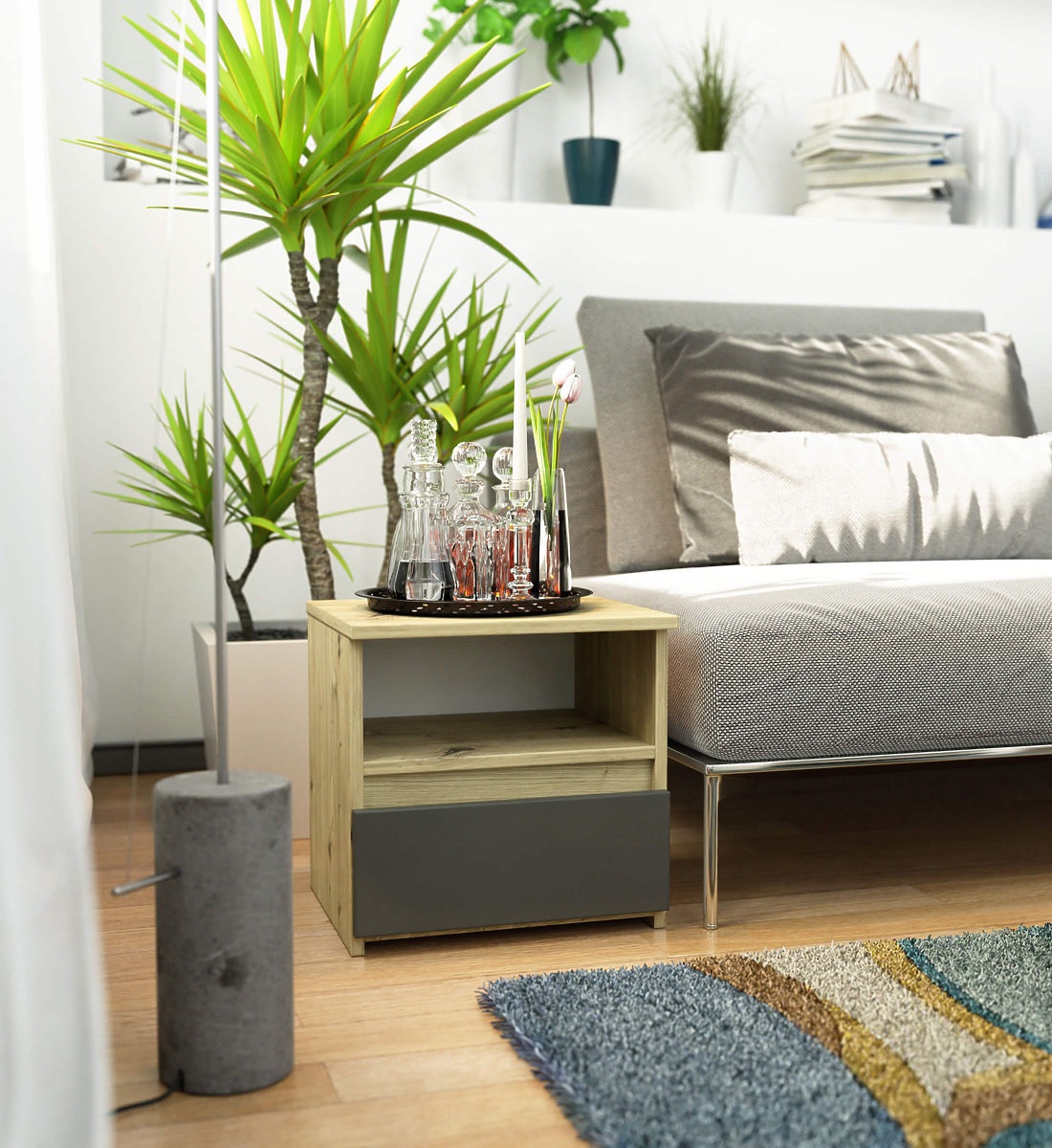 Noční stolky jsou oblíbeným typem nábytku, který se umisťuje vedle postele. Na jeho desce se nejčastěji nachází lampička, zatímco uvnitř předměty usnadňující odpočinek a spánek. Osoby, které hledají elegantní komodu, by měly věnovat pozornost nočnímu stolku CL1 40 cm v barvě dub artisan grafit šedá. Bude se krásně vyjímat v každé ložnici. Lze jej také umístit do dětského pokoje.