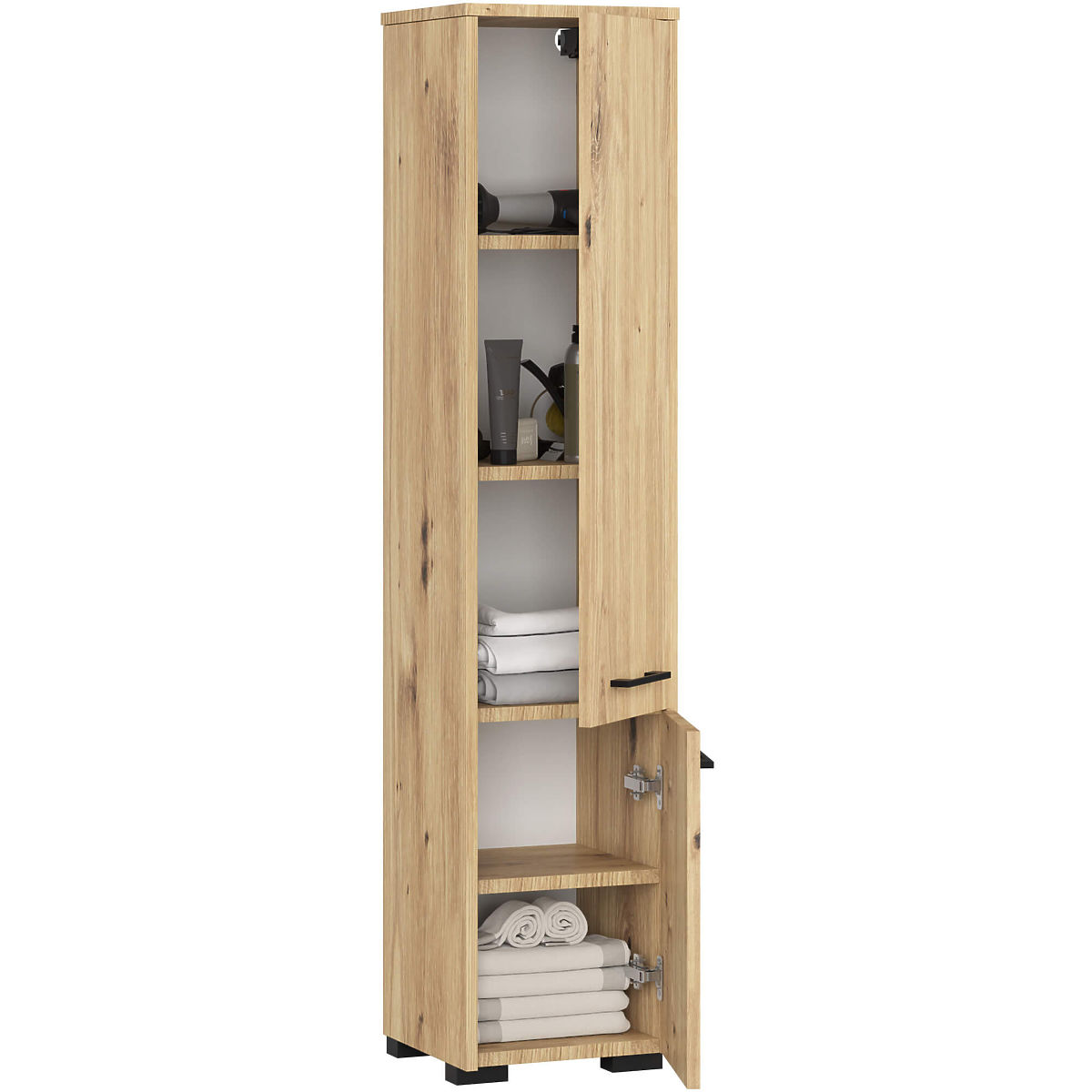 Koupelnová skříňka Fin 2 dveře je univerzální kus nábytku, který lze využít v každé koupelně, bez ohledu na její velikost. Elegantní design a barevnost dub artisan zajišťuje, že skříňka dokonale ladí s koupelnou v jakémkoli stylu, s klasickým nebo moderním vybavením, a také s dlažbou a obklady v různých odstínech. Díky svým rozměrům může koupelnová skříňka vyplnit často nevyužitý prostor v rohu koupelny, stejně jako být umístěna vedle umyvadla, pračky nebo sprchového koutu. Stojící koupelnová skříňka Fin se vyznačuje velmi pečlivým zpracováním. Má dvoje pohodlná a široká dvířka s ergonomickými úchyty, které zajišťují pohodlný přístup do vnitřku nábytku. Hluboké a prostorné police jsou ideální pro ukládání ručníků, toaletních potřeb, kosmetiky nebo čisticích prostředků. Koupelnová skříňka je vyrobena z laminované desky odolné proti oděru a působení vody. ABS hrany, kterými je skříňka zakončena, jsou odolné, neodbarvují se a dodatečně chrání skříňku před poškozením.