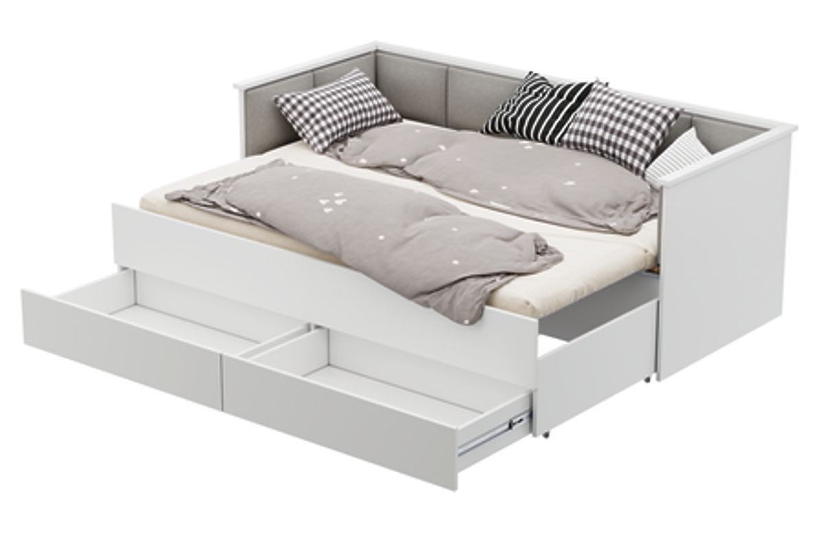 Rozkládací postel pro mládež HELIOS dostupná v bílé barvě je dokonalou kombinací elegance a funkčnosti. Díky možnosti rychlého rozložení na dvojitou postel (160x200 cm) je ideálním řešením jak pro menší, tak i větší pokoje.