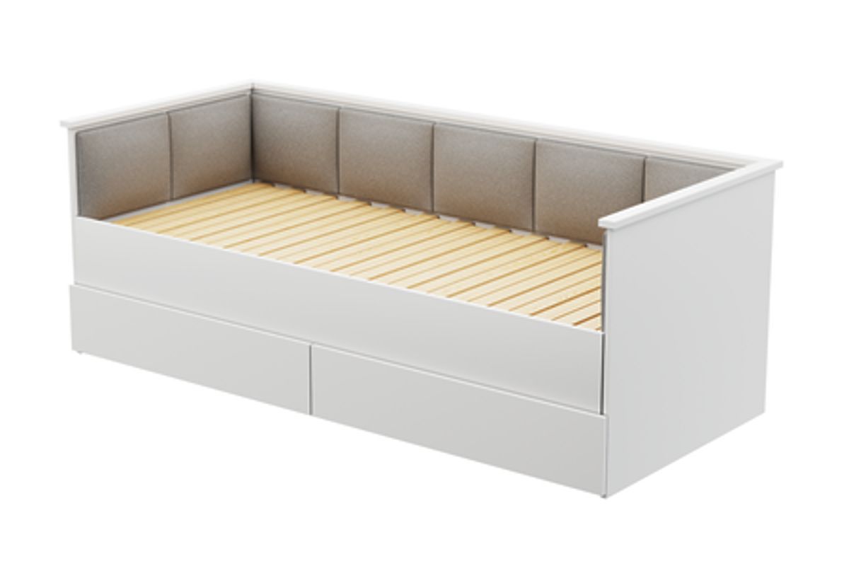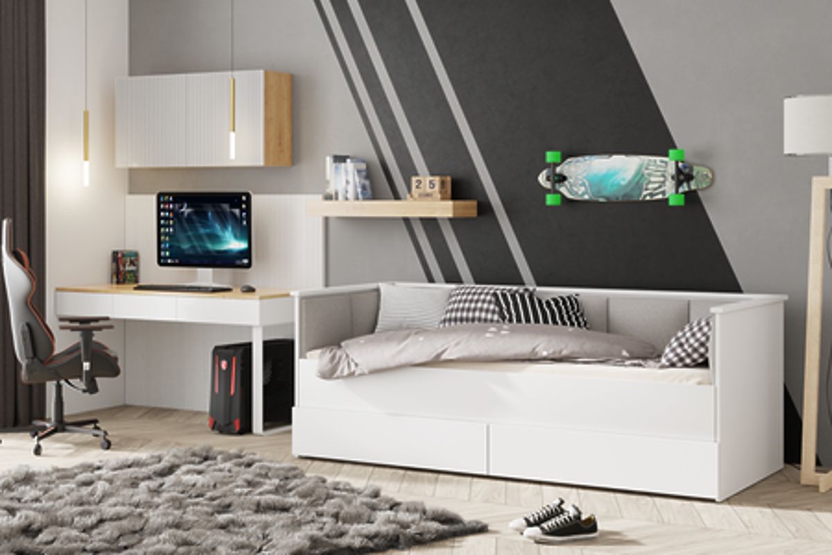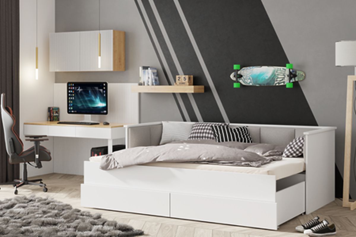 Minimalistický design postele HELIOS, obohacený o čalouněné panely z vysoce kvalitního materiálu typu velvet, dodává interiéru moderní a elegantní charakter. Panely nejsou jen estetickým doplňkem, ale také praktickým prvkem, který zajišťuje pohodlnou oporu při čtení, sledování televize nebo učení. Měkký a příjemný na dotek materiál přidává teplo a útulnost, podtrhující přátelský charakter pokoje pro mládež. Navíc je postel vybavena dvěma prostornými zásuvkami na kuličkových pojezdech, které umožňují ukládání ložního prádla, oblečení nebo jiných drobností. Takové řešení nejen pomáhá udržovat pořádek, ale také optimálně využívá prostor, což je zvláště důležité v menších pokojích.