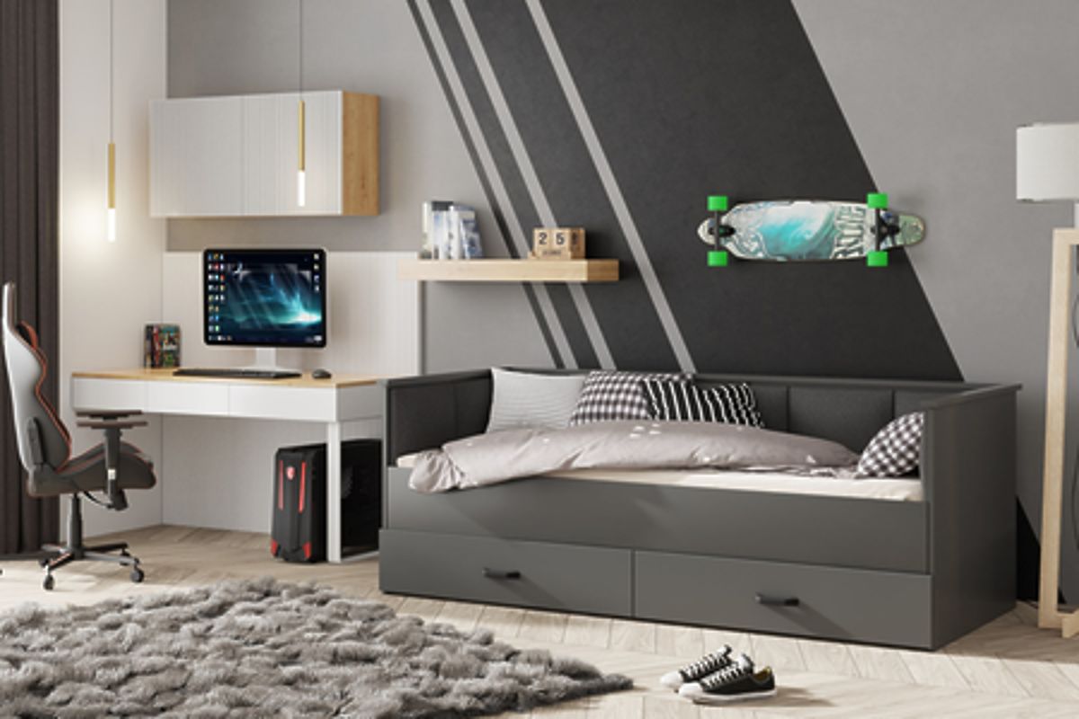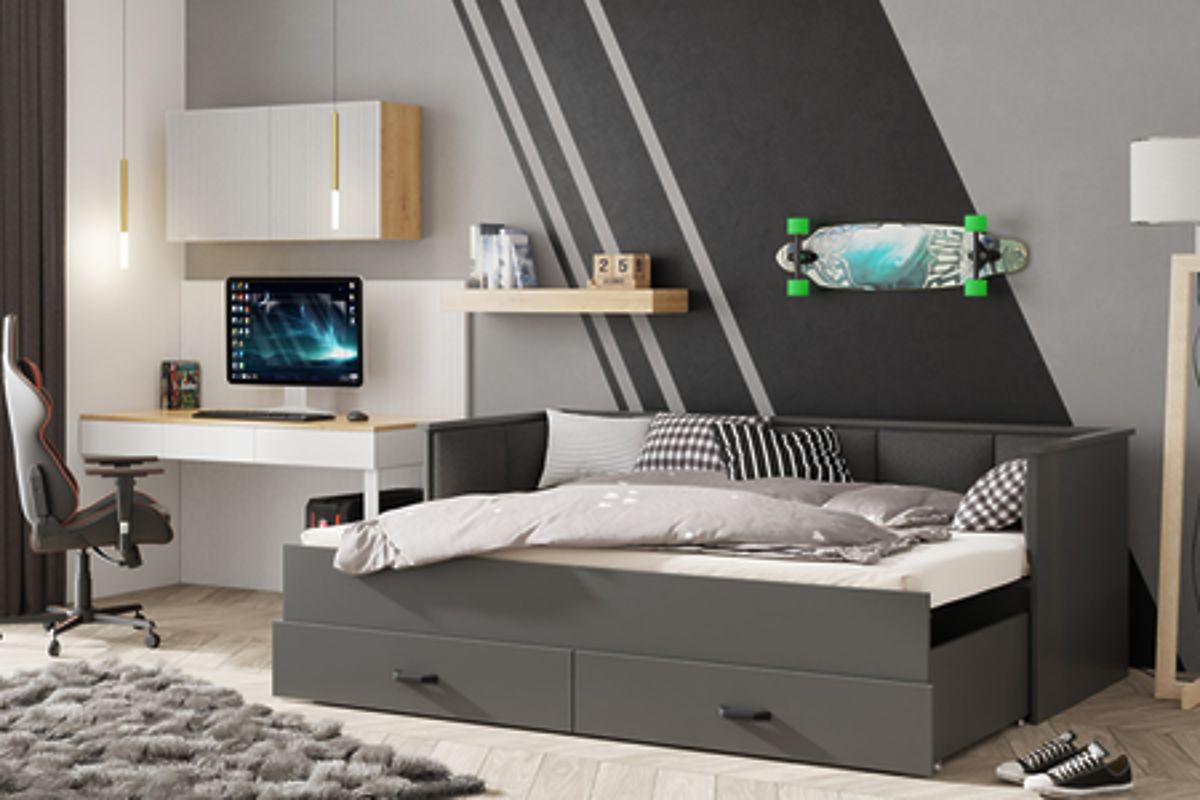 Minimalistický design postele HELIOS, obohacený o čalouněné panely vyrobené z vysoce kvalitního materiálu typu velvet, dodává interiéru moderní a elegantní charakter. Panely nejsou jen estetickým doplňkem, ale také praktickým prvkem, který poskytuje pohodlnou oporu při čtení, sledování televize nebo studiu. Měkký a příjemný na dotek materiál dodává teplo a útulnost, zdůrazňujíc přátelský charakter mládežnického pokoje. Navíc je postel vybavena dvěma prostornými zásuvkami na kuličkových pojezdech, které umožňují ukládání ložního prádla, oblečení nebo jiných drobností. Toto řešení nejen pomáhá udržovat pořádek, ale také optimálně využívá prostor, což je zvláště důležité v menších pokojích.