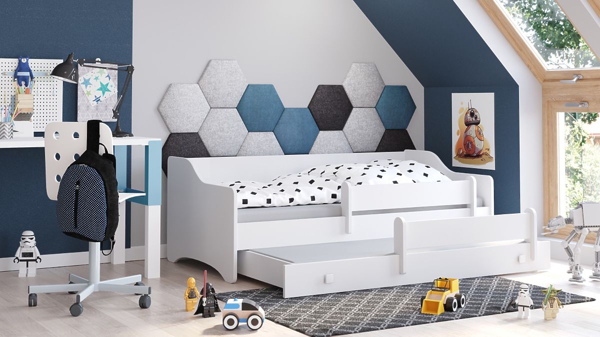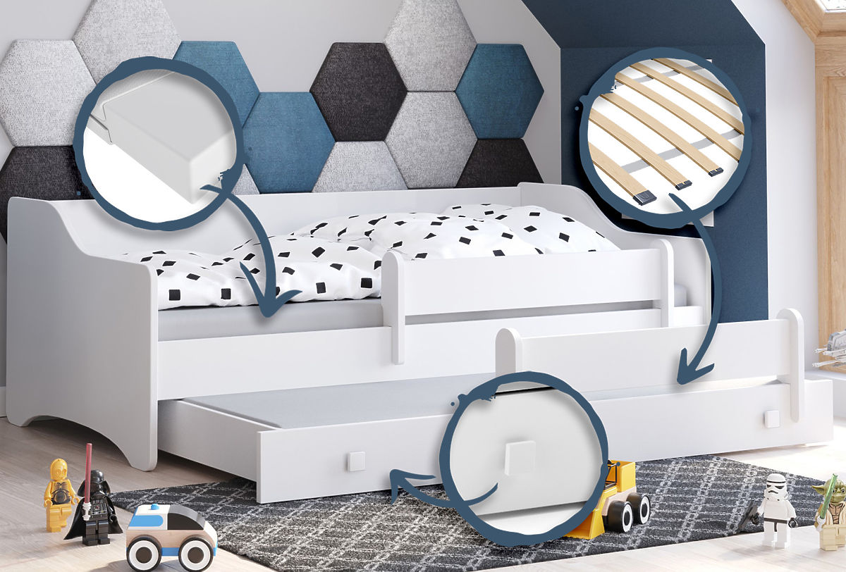 Díky pevné konstrukci a odolným materiálům postel Eryk zaručuje stabilitu a dlouhověkost. Zaoblené hrany a pohyblivá ochranná zábrana zajišťují, že dítě je během spánku v bezpečí, a pružný rošt FLEX s pružinovými lamelami poskytuje pohodlí a správnou podporu. Dolní spací plocha, i když není určena k ukládání věcí, je ideálním řešením pro pohodlné spaní pro sourozence nebo přátele, kteří mohou trávit čas společně. Postel Eryk je kombinací elegance, praktičnosti a bezpečnosti, která bude sloužit po mnoho let.