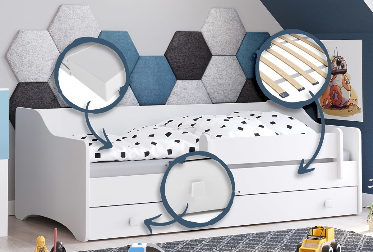 Vyrobena z vysoce kvalitní nábytkové desky, postel Eryk zaručuje pevnost a odolnost proti poškození. Navíc, přírodní jedlové dřevo, z něhož je vyroben rám, přináší do interiéru teplo a přirozený půvab. Postel má zaoblené hrany, což minimalizuje riziko úrazů, a praktický šuplík na ložní prádlo nebo hračky, což pomáhá udržovat pořádek v pokoji. Pohyblivá zábrana poskytuje dodatečnou ochranu dítěti, a rám FLEX s pružinovými lamelami zaručuje pohodlný spánek. Je to ideální volba pro každého rodiče, který si cení bezpečnosti, pohodlí a estetiky.