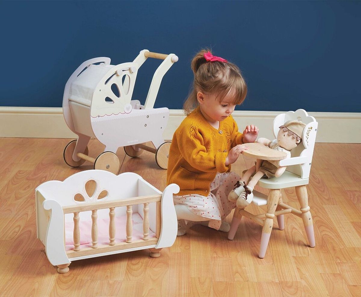 Krásná dřevěná židlička je perfektní pro hru na role! Vhodná pro plyšáky a panenky ve velikosti asi 35 cm, mladé maminky a tatínky inspiruje k představivé hře.Je vyrobena z odolného a udržitelného kaučukového dřeva, nenajdete zde žádný plast, opravdová eko zábava!Židlička má mnoho detailů, ozdobné nohy, designové výřezy v opěrce, zlaté květinové zdobení. Mezi její praktické vybavení patří opěrka na nohy a podnos. Opravdu realistická jídelní židle pro hladové hračky. K židličce se krásně hodí postýlka Sleigh a kočárek Sweet Dreams, které najdete v záložce „příslušenství“. Hračky s účelemVšechny hračky firmy Le Toy Van jsou vyrobeny s cílem – aby dlouho vydržely. Designovány s láskou zkušenými řemeslníky za použití etických praktik a udržitelných materiálů, které jsou laskavější k naší planetě. Hlavní vlastnosti: židlička pro panenkyvhodné pro hračky ve velikosti 30-35 cmvyrobeno eticky z udržitelného dřevaneobsahuje plasttestováno dle nejpřísnějších standardůmalováno netoxickými barvami na bázi vodyinspiruje k představivé hřeasistuje v rozvoji sociálních dovedností a řečipo rozbalení nutno složit dle návodu Ocenění hračky:Good Toy Guide Recommended Honeybake kolekce: Hračky v této kolekci jsou vhodné k objevování, pomohou dětem s rozvojem představivosti, sociálních a verbálních dovedností a kognitivních funkcí. Tradiční design s moderními detaily děti jistě bude bavit. Honeybake je kolekce Le Toy Van, která vyhrála nejvíce ocenění, a to za design, kvalitu, bezpečnost a také za vzdělávací a herní hodnotu.