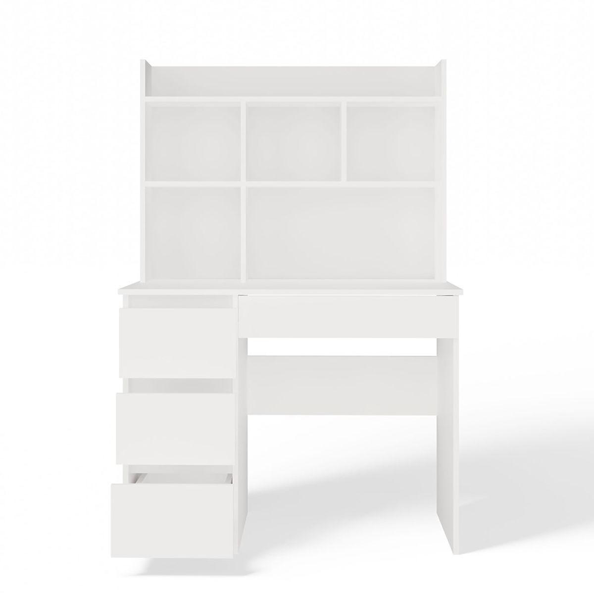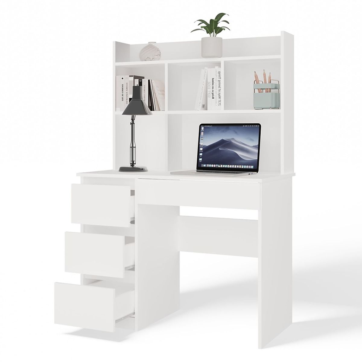 Biurko MIJAS Lewe Z Nadstawką Biel Mat 4 Szuflady 4 Półki Do Biura Pokoju