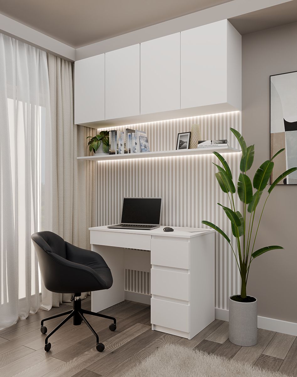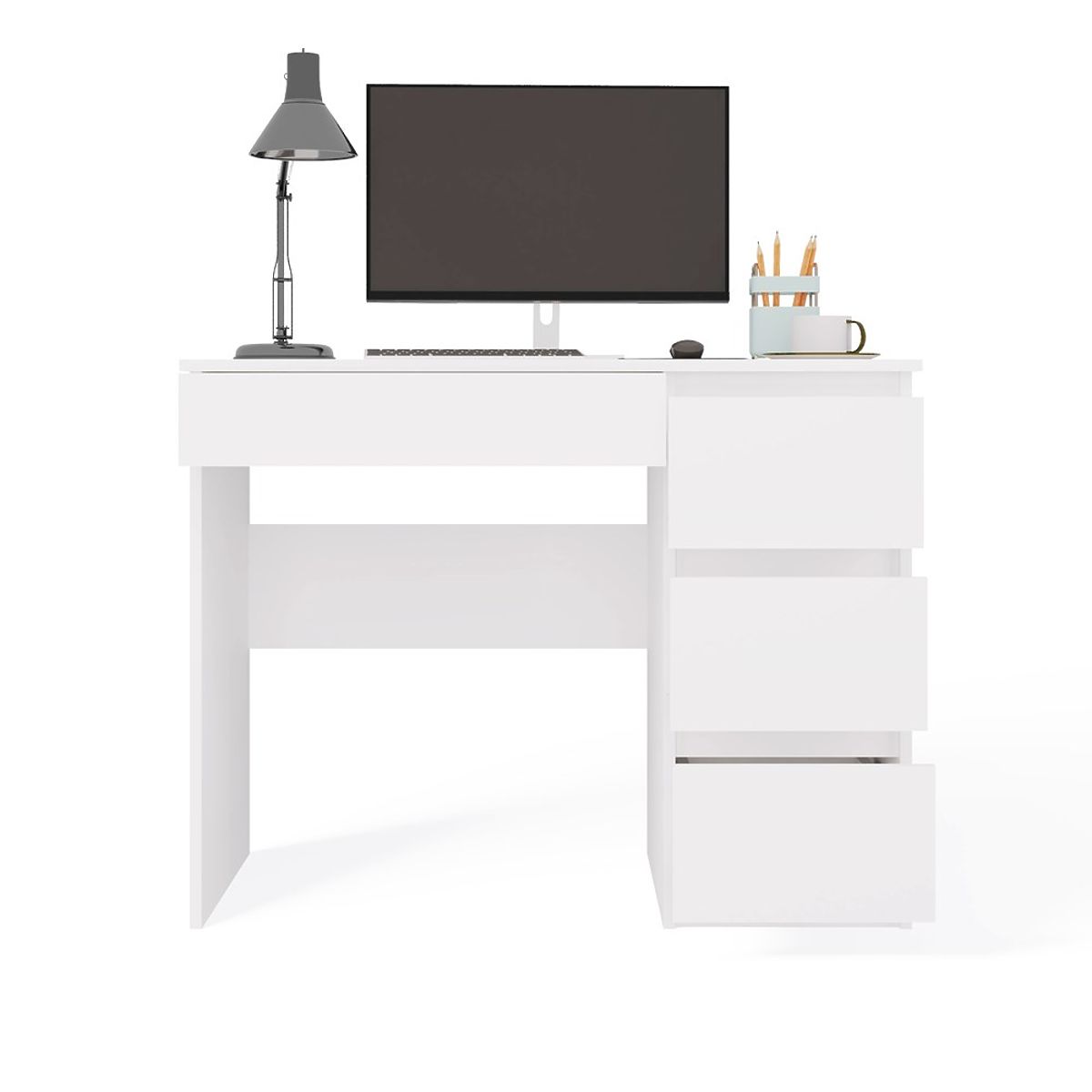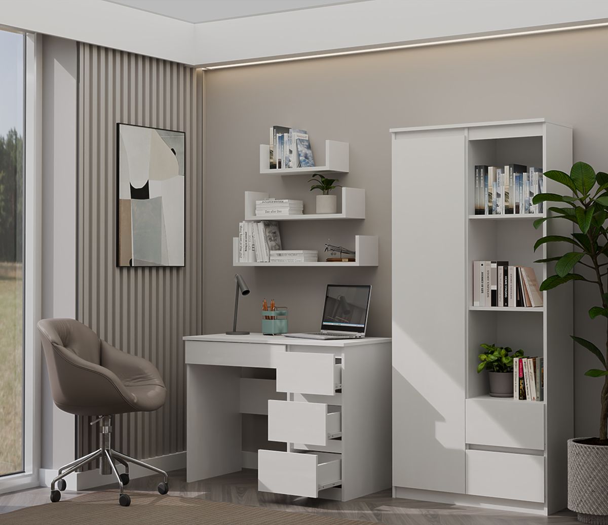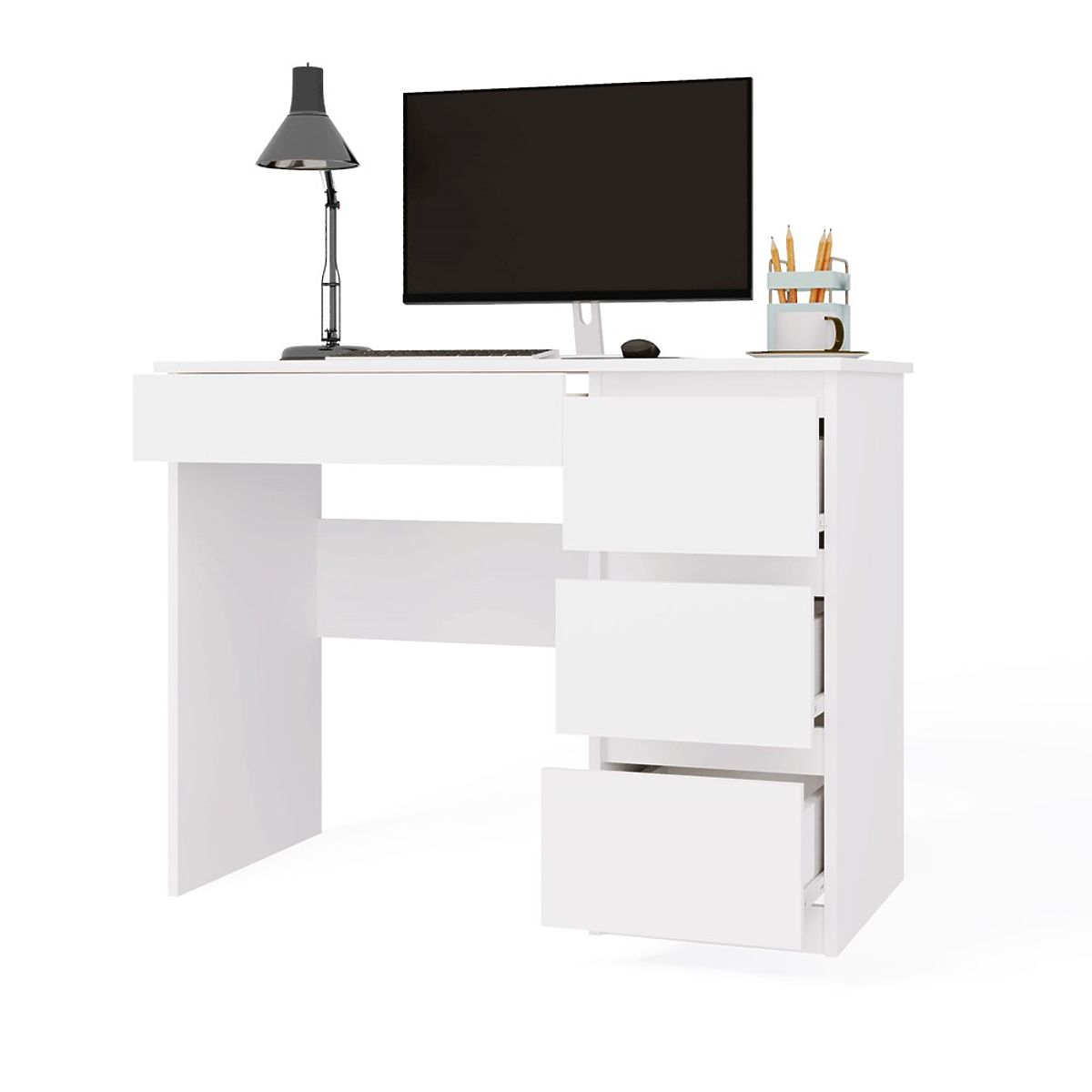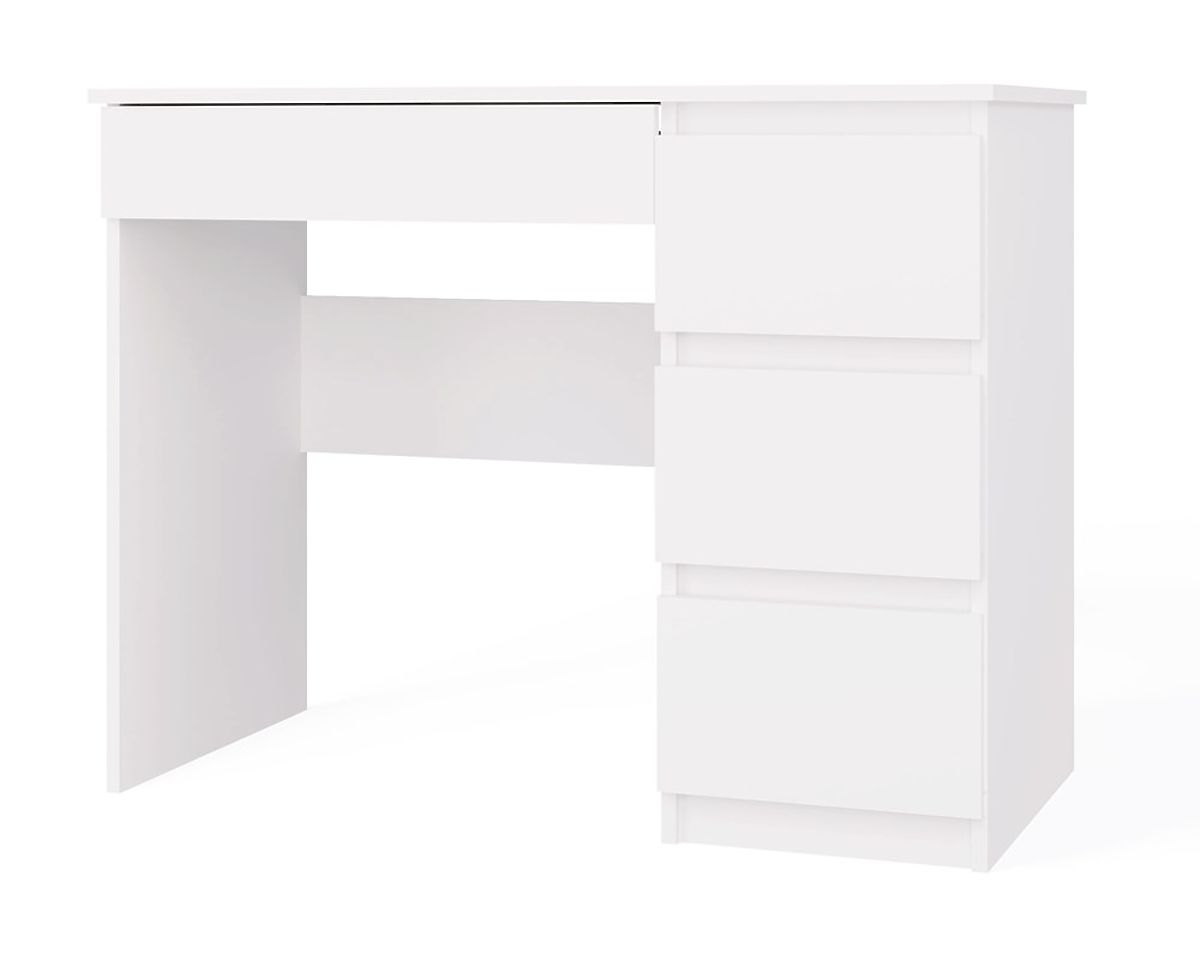 BARVA: BÍLÁ Psací stůl model „MIJAS“ se skvěle hodí jak do domácích pokojů, tak i do kanceláře. ideální místo pro notebook čela zásuvek bez úchytek 3 prostorné vysoké zásuvky vlevo a jedna nízká vpravo pod deskou stolu funkčnost jednoduchá a moderní konstrukce vytváří pohodlný pracovní prostor hladké boky bez krytek snadná montáž montážní návod v balení český výrobce MATERIÁL: Korpus a čela – laminovaná dřevotřísková deska 16 mm.